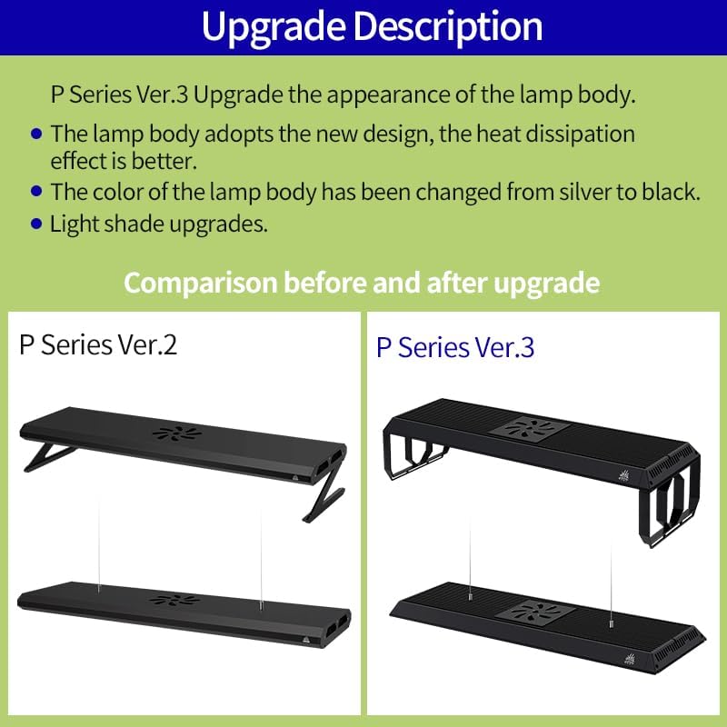 | Light Source Special Features | RGB+UV full spectrum, 6 preset modes, 5 customizable settings, seamless dimming, sunrise and sunset modes, customizable timers, color and brightness adjustments |