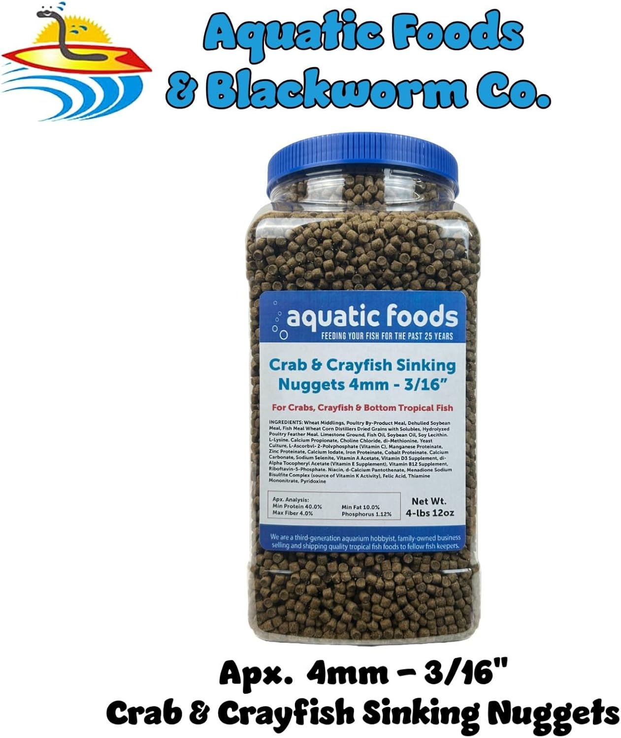 Aquatic Foods & Blackworm Co. 4mm - 3/16" Crab & Crayfish Sinking Nuggets - For Crabs, Crayfish & Bottom Feeding Tropical FishIngredients:Wheat Middlings, Poultry By-Product Meal, Dehulled Soybean Meal, Fish Meal, Wheat, Corn, Distiller's Dried Grains with Solubles, Hydrolyzed Poultry Feather Meal, Ground Limestone, Fish Oil, Soybean Oil, Soy Lecithin, L-Lysine, Calcium Propionate, Choline Chloride, DL-Methionine, Yeast Culture, L-Ascorbvl- 2-Polvphosphate (Vitamin C), Manganese Proteinate, Zinc Proteinate, Calcium Iodate, Iron Proteinate, Cobalt Proteinate, Calcium Carbonate, Sodium Selenite, Vitamin A Acetate, Vitamin D3 Supplement, DL-Alpha Tocopheryl Acetate (Vitamin E Supplement), Vitamin B12 Supplement, Riboftavin-5-Phosphate. Niacin, D-Calcium Pantothenate, Menadione Sodium Bisulfite Complex (source of Vitamin K Activity), Folic Acid, Thiamine Mononitrate, PyridoxineApx. Analysis:Min Protein 40.0%Min Fat 10.0%Max Fiber 4.0%Phosphorus 1.12%