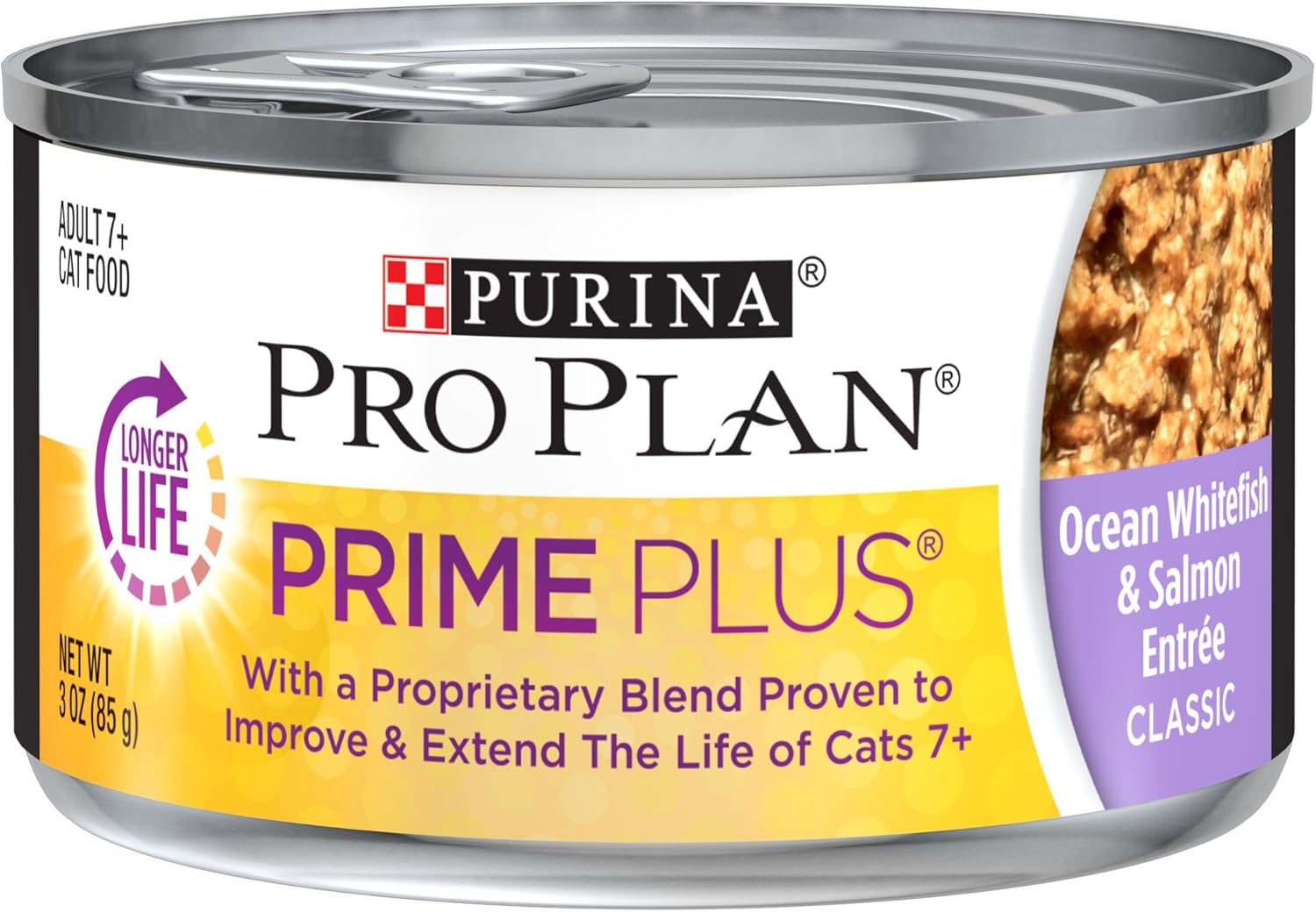 Rely on Purina Pro Plan Prime Plus Ocean Whitefish and Salmon Entree SENIOR Adult 7+ wet cat food to care for your older adult cat. A proprietary blend in this senior cat food is proven to improve and extend the life of cats 7+. The findings are based on cats exclusively fed a complete diet with the proprietary blend versus cats fed the complete and balanced diet alone. This grain free pate cat food starts with real ocean whitefish as the number 1 ingredient and includes real salmon for the full-of-flavor meal she craves. This grain free wet cat food provides your senior cat with the antioxidants beta carotene and vitamin E for a healthy immune system as well as natural prebiotic fiber for digestive health. High protein helps her maintain an ideal body condition, and 25 essential vitamins and minerals plus taurine, an amino acid, help her thrive by your side. We proudly manufacture this premium cat food with no artificial colors or preservatives at Purina-owned, U.S. facilities.