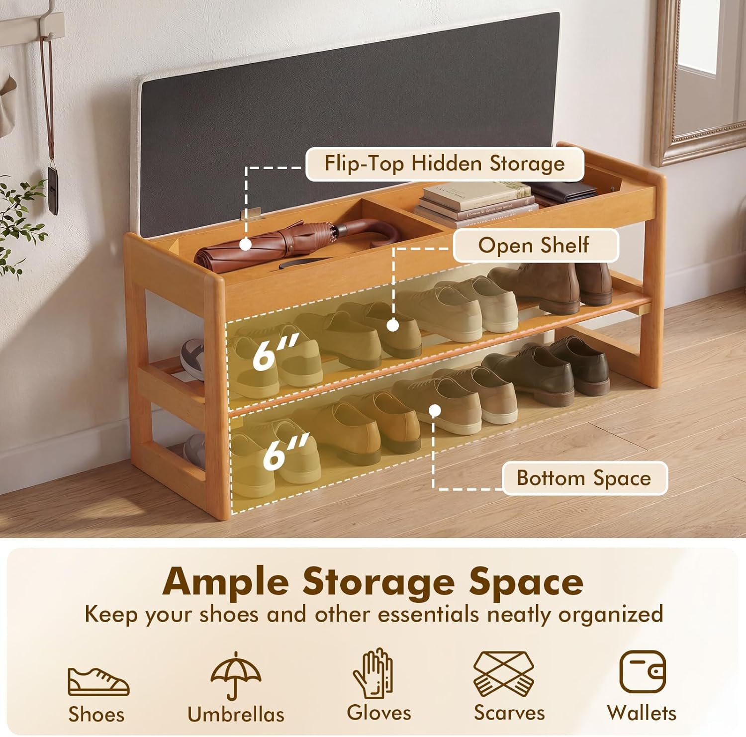 Description:Upgrade your living area with this shoe bench that combines practical storage and cozy seating!Featuring flip-top storage compartments and a slatted open shelf, it offers ample storage space to keep your shoes and other essentials neatly organized. The soft padded seat with breathable linen fabric upholstery and high-resilience sponge filling provides a cozy seating experience. Built with an A-shaped solid rubberwood frame, the entryway bench ensures lasting durability and stability, effortlessly supporting up to 400 lbs. Perfect as a shoe storage bench or end-of-bed bench, it complements any entryway, living room, or bedroom with its stylish design.Features:Soft padded seat with high-resilience sponge filling for comfortSkin-friendly linen upholstery provides breathabilityFlip-top hidden storage for organizing small accessoriesOpen shelf with slatted design promotes airflow to keep shoes fresh and drySolid rubberwood side frame ensures strong support and lasting durabilityA-shaped structure ensures enhanced stabilityBottom space provides room for cleaning underneathSmooth rounded corners protect from accidental bumpsPremium metal hinges allow for smooth flip-top operationSuitable for entryway, living room, or bedroomAssembly neededSpecifications:Color: Natural + Beige/Natural + Brown Material: Rubberwood, MDF, Plywood, Sponge, LinenOverall Dimensions: 40" x 13.5" x 17" (L x W x H)Dimensions of Shelf: 37.5" x 13.5" x 6" (L x W x H)Dimensions of Each Compartment: 17.5" x 9.5" x 2" (L x W x H)Weight Capacity of Top: 400 lbsWeight Capacity of Shelf: 33 lbsNet Weight: 22 lbsPackage Includes:1 x Shoe Storage Bench1 x InstructionWhy Choose Our Shoe Rack Bench?√ Flip-top storage compartments provide discreet organization for small accessories√ Solid rubberwood side frame with A-shaped structure ensures stability