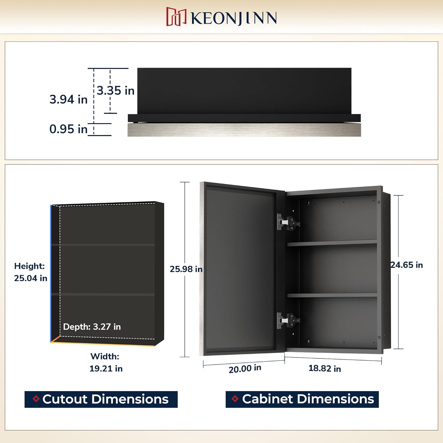 | Additional Features | Adjustable Shelf, Moisture Resistant, Recessed or Surface Wall Mounted, Removable Shelf, Rust Resistant |