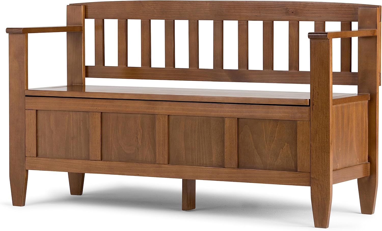 Designed for modern living, the Brooklyn Entryway Storage Bench offers a streamlined solution for seating and organization. Measuring 48 inches wide and 28 inches tall, it’s comfortably sized for two while providing concealed storage beneath the seat. Crafted from solid wood and finished in medium saddle brown, this bench highlights the clean lines and minimal aesthetic of contemporary style. Its squared-off shaker panels, vertical slat back, and tapered legs bring subtle architectural detail, while the lift-up lid reveals two spacious storage compartments, ideal for shoes, bags, or everyday essentials. A protective NC lacquer finish enhances the wood’s natural texture and adds lasting durability. With safety hinges for smooth, controlled closure, this bench is thoughtfully built for daily use in entryways, bedrooms, or hallways where clean design and functionality matter most.