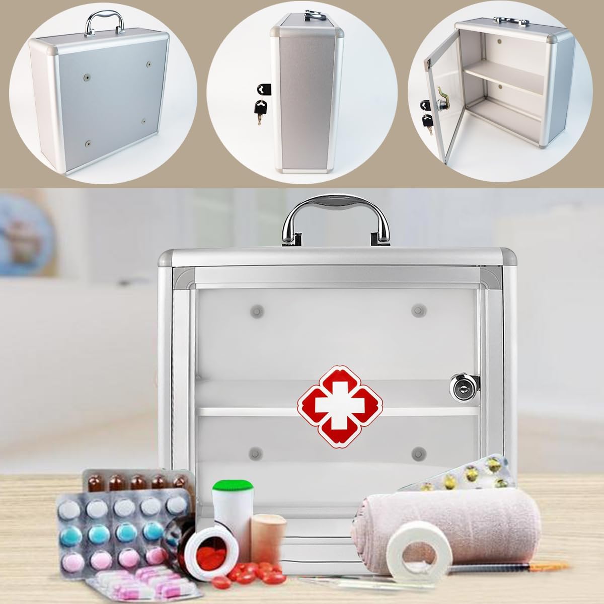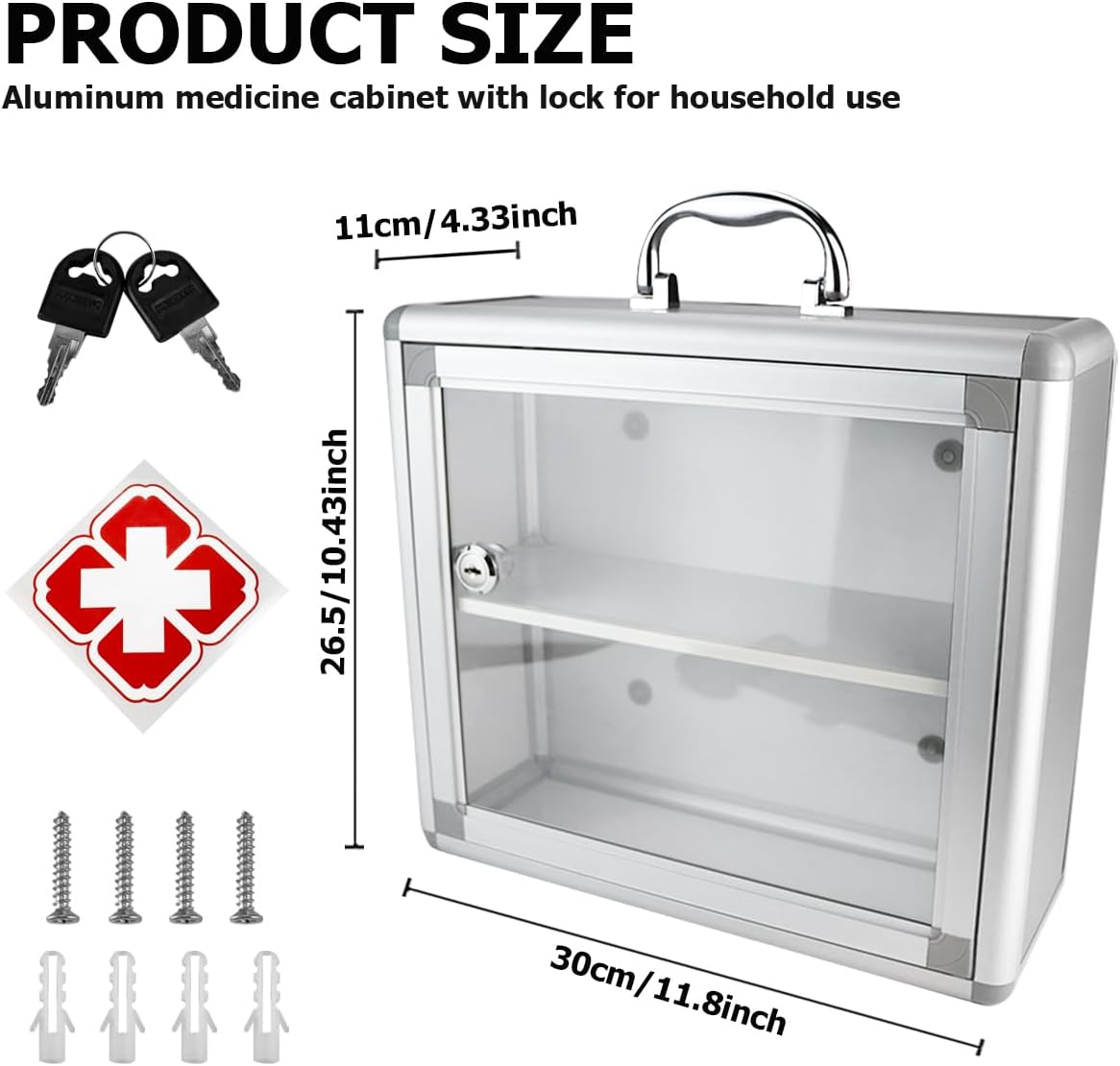 Medicine Cabinet with Lock, Wall mounted Bathroom Storage, Hanging Medical Cabinet, First Aid Wall Cabinet with Safety Glass Door Product Features: 1. Security Protection:Reliable lock design, protects medicines from unauthorized access. 2. Durable and reliable: aluminum alloy material, strong and durable, pressure-proof, waterproof and dustproof. 3. Multi-functional design: multi-layer compartments, organize and store medicines, first aid supplies, health care products and so on. 4. Portable and lightweight: compact design, equipped with handles, easy to carry and move. Specification: Material: aluminum alloy and fiberboard Size: 11.8*10.434.33in Color: Silver Package Including 1 x Medicine Box 4 x Setscrews 2 x Keys A versatile storage box can provide enough space to contain medicines. Lightweight medicine organizing box, perfect for home, office, schools, outdoor trip, etc. Aluminum alloy medical box is suitable for: 1.Family: convenient for storing and managing family members' commonly used medicines, first aid supplies, health care products, etc. 2.Traveling: compact design is easy to carry, you can carry essential medicines and first aid supplies with you. 3.WILD CAMPING: Durable and reliable structural design, waterproof and dustproof, suitable for storing and using medicines and first aid supplies in the wild environment.
