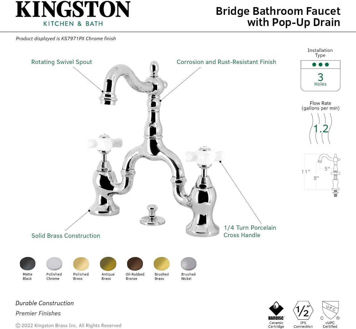 Embody the extravagance of 18th century Europe by adorning your house with the traditional elegance offered by this faucet. Elegantly designed, the exquisite arch connecting the spout to the handles provides an added aesthetic appeal to make for more of a statement piece. Additionally, the 8-1/16 inch of spout clearance make for a very easy hand washing experience with plenty of room for other tasks. The English Country bridge bathroom faucet and its featured sturdy brass construction and premium brushed nickel finish are guaranteed to glamorize your home's traditional ensemble for years to come. A matching finish drain is also included.