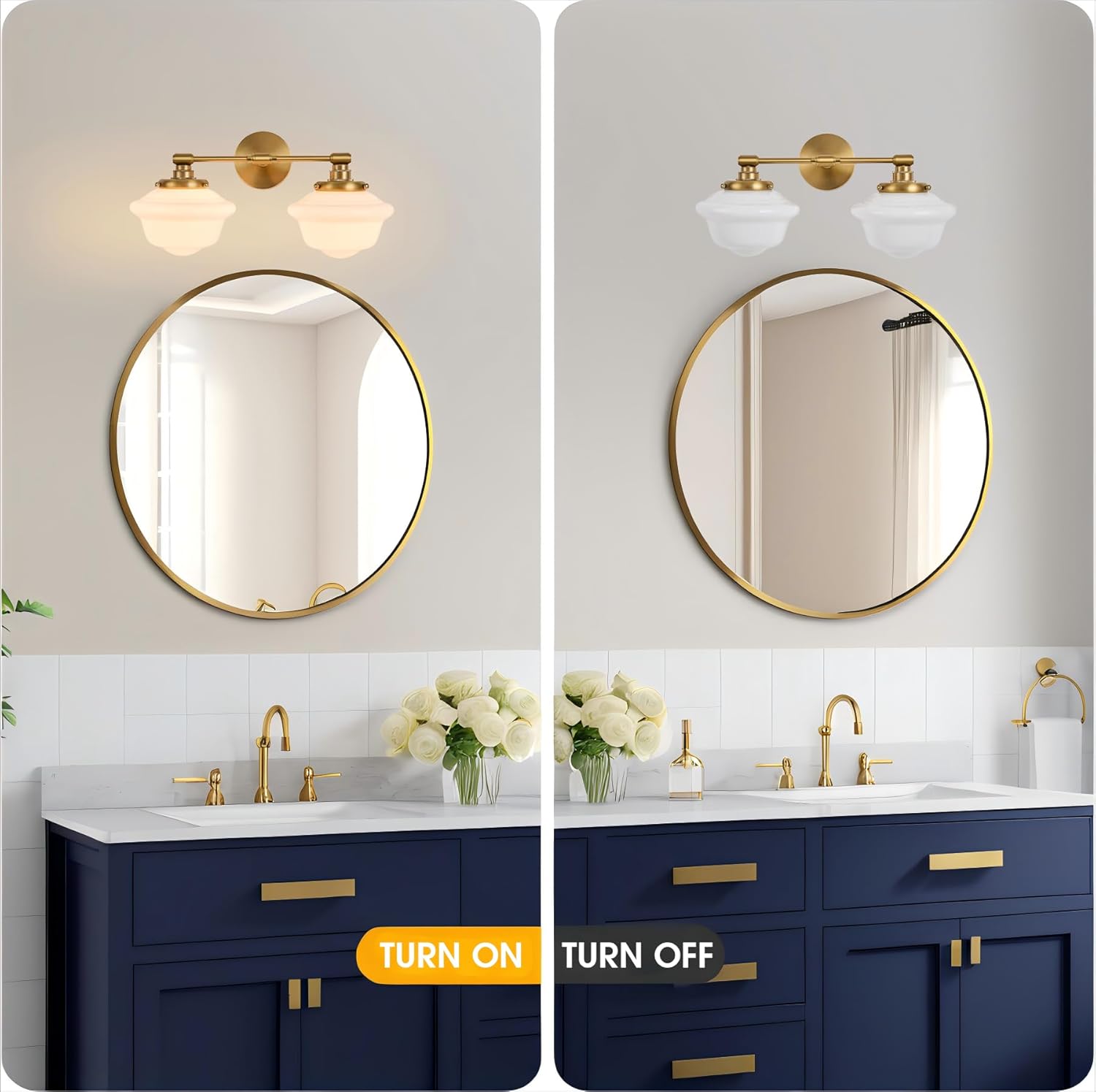 Elevate your bathroom's aesthetic with this sophisticated 2-light vanity fixture featuring a luxurious brushed gold finish and elegant milk glass shades. The wall-mounted design creates perfect illumination for your daily routines while adding a touch of modern farmhouse charm to your space. Measuring 16 inches in length and extending 10 inches from the wall, this fixture provides optimal coverage above your mirror or vanity area. The premium metal construction ensures durability, while the frosted milk glass shades diffuse light beautifully for a soft, warm glow. Compatible with standard E26 base bulbs and supporting up to 60 watts per socket, this hardwired fixture delivers ample brightness for all your bathroom lighting needs. The timeless combination of brushed gold finish and white glass shades complements various interior styles, from contemporary to farmhouse. Perfect for powder rooms and master bathrooms alike, this versatile lighting fixture balances both form and function with its clean lines and quality craftsmanship. Installation hardware and manual included for straightforward wall mounting.