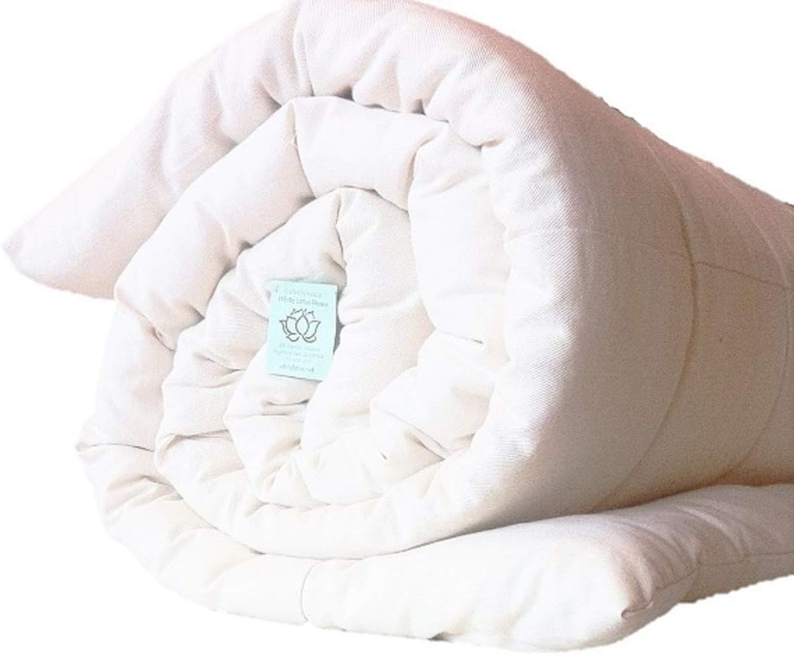 This green cotton topper is made with a 100Percent cotton case and the inside is 100Percent cotton layers. A White Lotus Home topper is made to lie under your fitted sheet, it can be used on top of any mattress and to Replace a pillow top. This comfy addition to your nest is 1 1/2 inch thick made up of 3 layers of pure cotton inside and a 100Percent cotton case. It is also available in double the thickness. Wonderfully easy to air out and better than a feather bed any day...or night