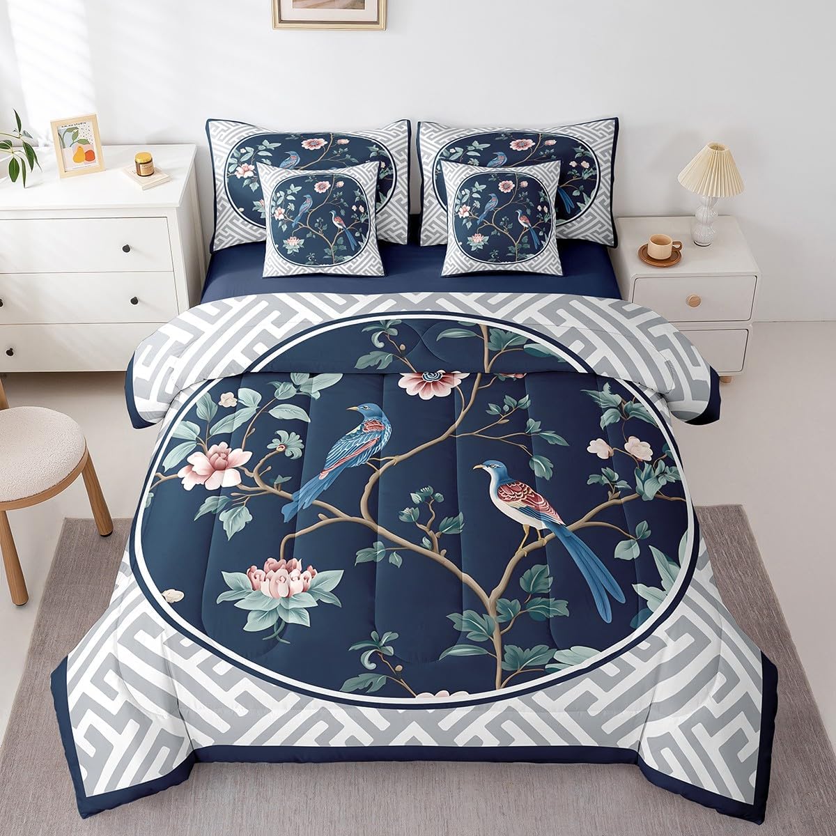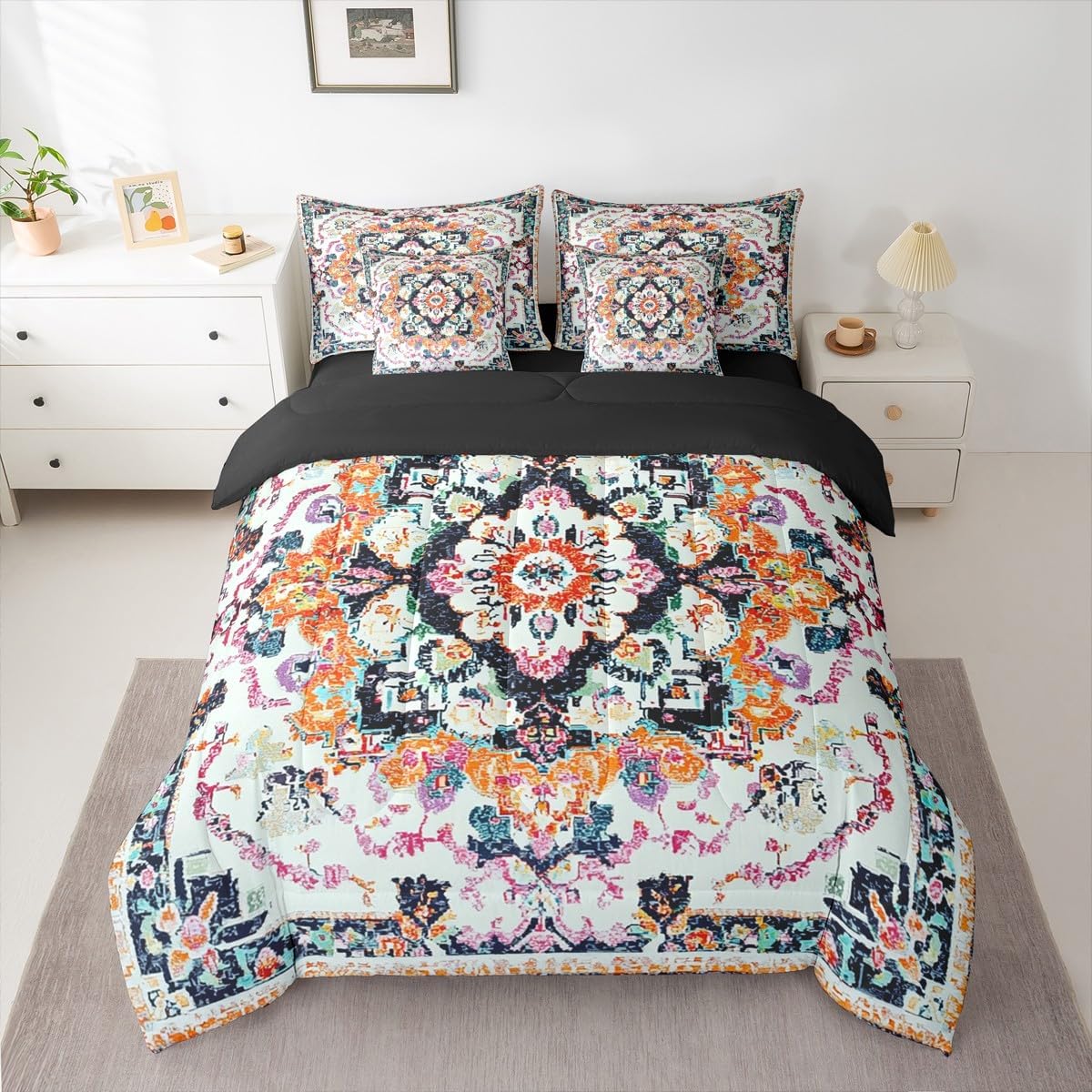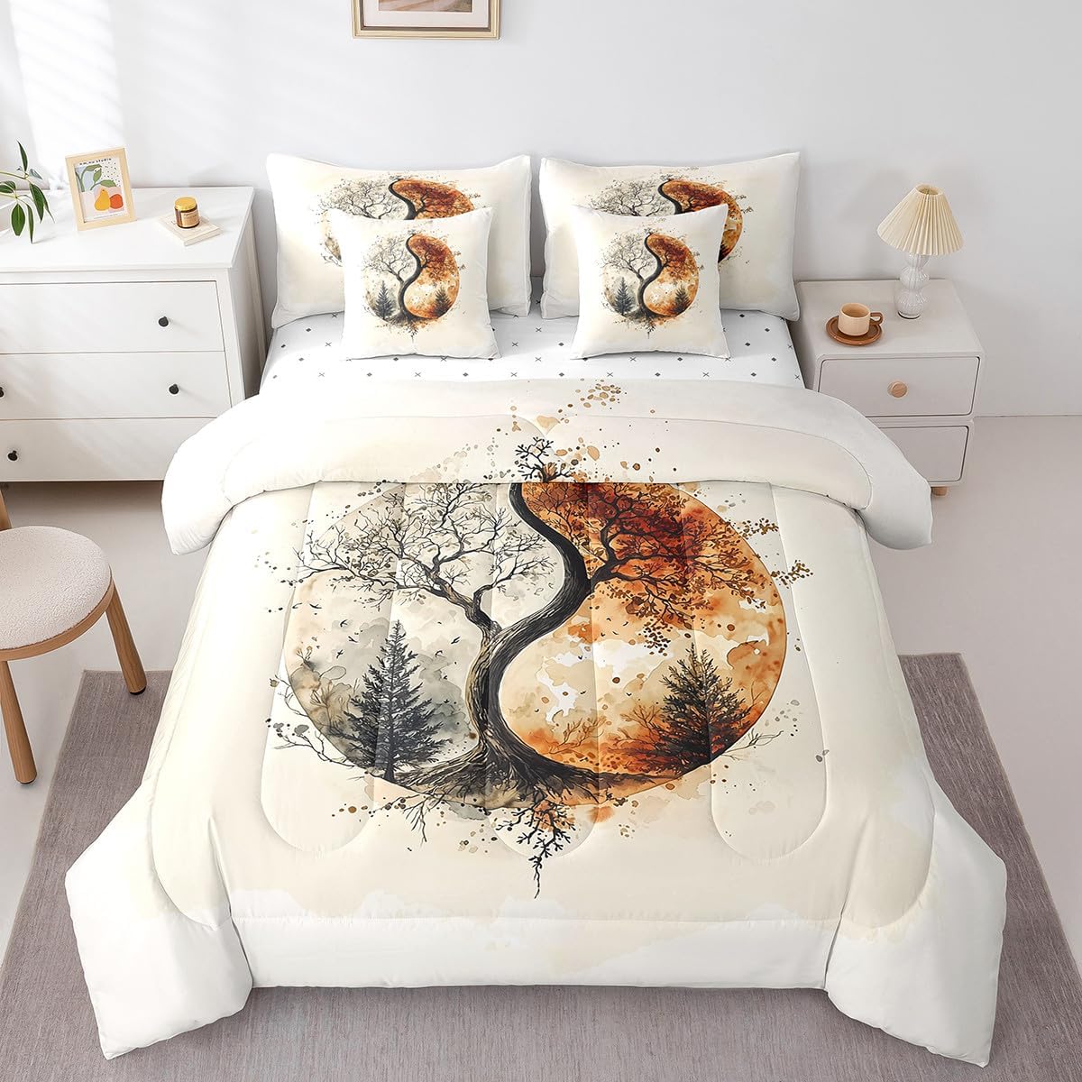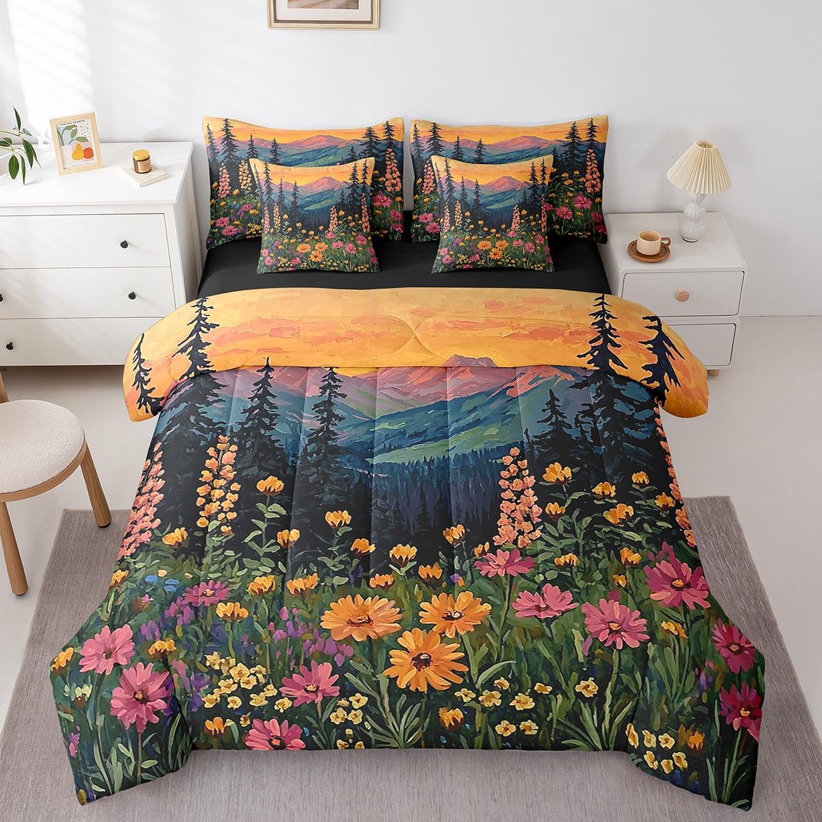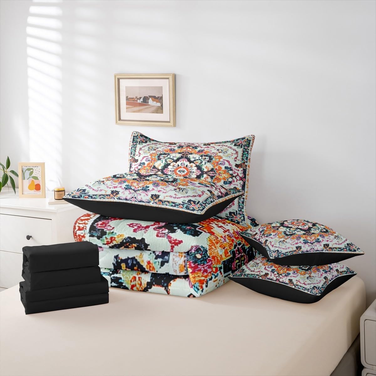 Size Information Twin : 1 Comforter: 68"x90",1x Fitted Sheet 39"x75"x16",1x Flat Sheet 96"x66",2x Pillowcases 20"x30" and 2 Pillow Cover 18"x18" Full : 1 Comforter: 79"x90",1x Fitted Sheet 54"x75"x16",1x Flat Sheet 96"x66",2x Pillowcases 20"x30" and 2 Pillow Cover 18x18" Queen : 1 Comforter: 90"x90",1x Fitted Sheet 60"x80"x16",1x Flat Sheet 102"x90",2x Pillowcases 20"x30" and 2 Pillow Cover 18"x18" King : 1 Comforter: 104"x90",1x Fitted Sheet 78"x80"x16",1x Flat Sheet 106"x90",2x Pillowcases 20"x36" and 2 Pillow Cover 18"x18" Style Variety: Available in multiple styles. Suitable Spaces: For use in bedrooms, guest rooms, living rooms, or RVs. Printing Process: Manufactured using reactive printing and dyeing technology. Design Feature: Diverse pattern options. Care Instructions: Machine washable. Air dry. Low-heat ironing recommended. Not suitable for bleach, dry cleaning, or machine drying. Intended Decor: Designed for home textile applications.