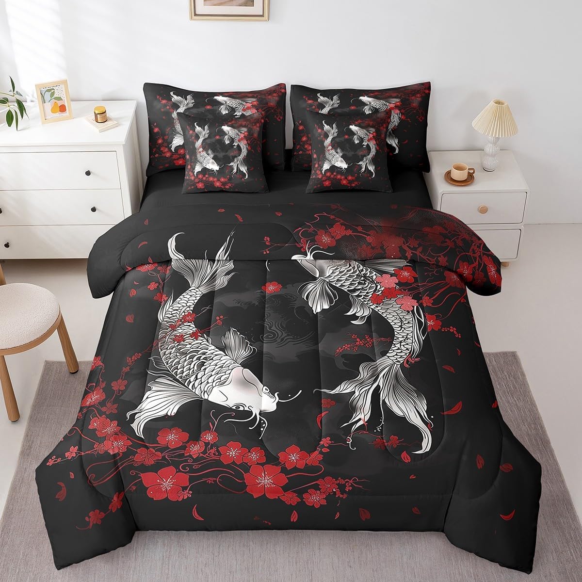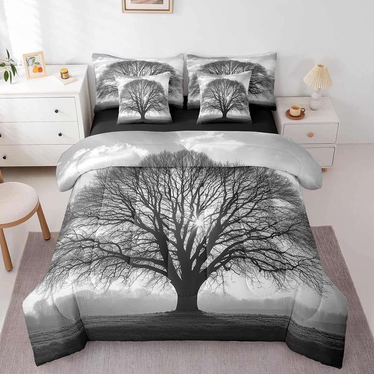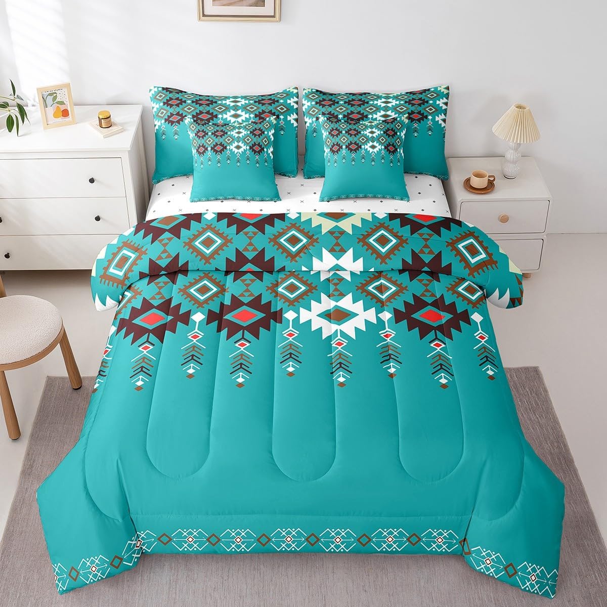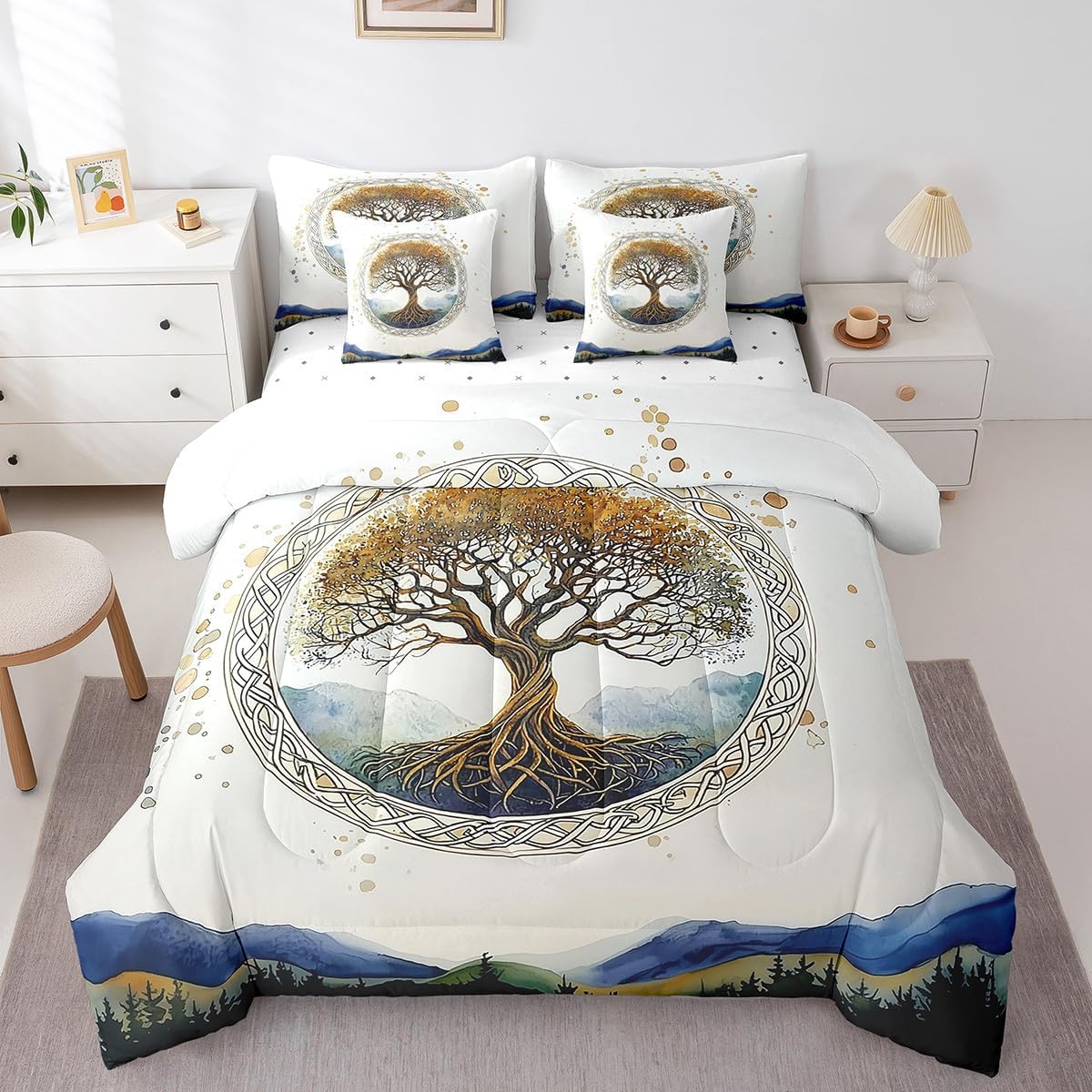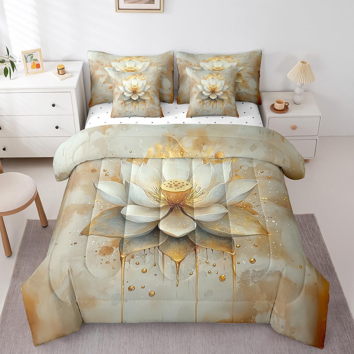 Size Information Twin : 1 Comforter: 68"x90",1x Fitted Sheet 39"x75"x16",1x Flat Sheet 96"x66",2x Pillowcases 20"x30" and 2 Pillow Cover 18"x18" Full : 1 Comforter: 79"x90",1x Fitted Sheet 54"x75"x16",1x Flat Sheet 96"x66",2x Pillowcases 20"x30" and 2 Pillow Cover 18x18" Queen : 1 Comforter: 90"x90",1x Fitted Sheet 60"x80"x16",1x Flat Sheet 102"x90",2x Pillowcases 20"x30" and 2 Pillow Cover 18"x18" King : 1 Comforter: 104"x90",1x Fitted Sheet 78"x80"x16",1x Flat Sheet 106"x90",2x Pillowcases 20"x36" and 2 Pillow Cover 18"x18" Style Variety: Available in multiple styles. Suitable Spaces: For use in bedrooms, guest rooms, living rooms, or RVs. Printing Process: Manufactured using reactive printing and dyeing technology. Design Feature: Diverse pattern options. Care Instructions: Machine washable. Air dry. Low-heat ironing recommended. Not suitable for bleach, dry cleaning, or machine drying. Intended Decor: Designed for home textile applications.