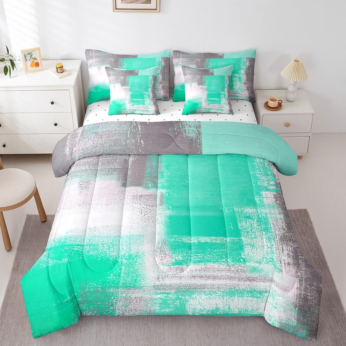 Colorful Makeover to Your Life Various size and color options, there are always decor room. Size Options: 7 Pieces Twin Size,1 Down Comforter 68"x 90", 1 Fitted Sheet 39"x75"x16", 1 Flat Sheet 96"x66", 2 Pillow Cases 30" x 20",2 Throw Pillow Covers,Covers Only. 18"x 18". 7 Pieces Full Size ,1 Down Comforter 79"x 90", 1 Fitted Sheet 54"x75"x16", 1 Flat Sheet 96"x81", 2 Pillow Cases 30" x 20",2 Throw Pillow Covers,Covers Only. 18"x 18". 7 Pieces Queen Size,1 Down Comforter 90"x 90", 1 Fitted Sheet 60"x80"x16", 1 Flat Sheet 102"x90", 2 Pillow Cases 30" x 20",2 Throw Pillow Covers,Covers Only. 18"x 18". 7 Pieces King Size,1 Down Comforter 104"x 90", 1 Fitted Sheet 78"x80"x16", 1 Flat Sheet 106"x90", 2 Pillow Cases 30" x 20",2 Throw Pillow Covers,Covers Only. 18"x 18". Decoration: For your mom, dad, sister, brother, grandma, wife, husband, and all other beloved with many surprising designs. You can find a design for everybody and every interest in our collection. Your Home,You Decide Different types of bedding sets could bring rooms in different styles. Also, rooms in different styles needs different types of bedding sets