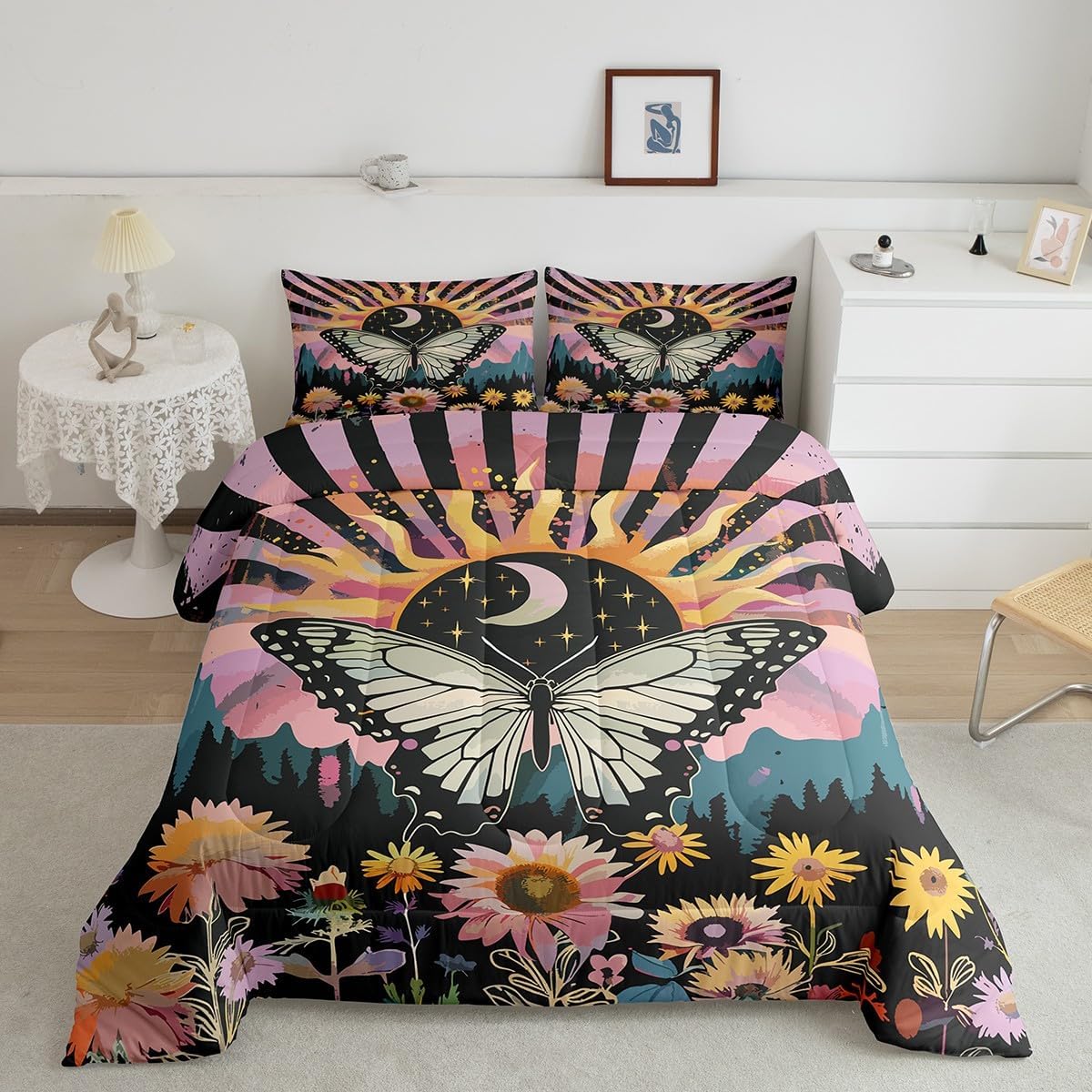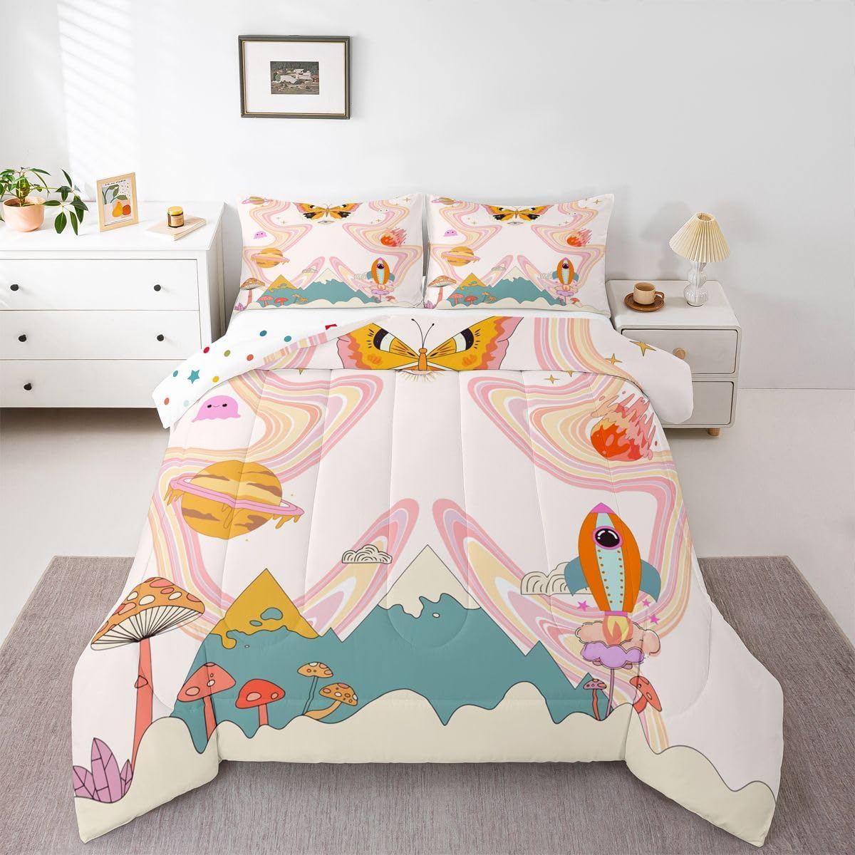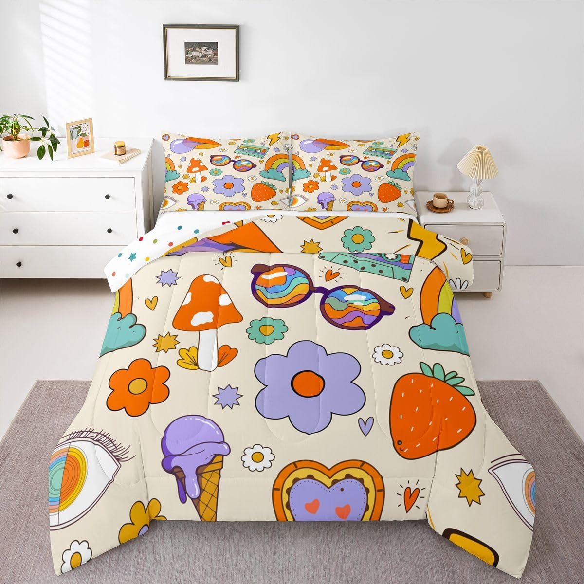 Erosebridal Trippy Mushroom Bedding Set Queen Groovy Floral Comforter Set Rainbow Striped Bedding Sets & Collections Hippie Boho Eye Duvet Starry Night Down Comforter 70s Theme Decor with 2 Pillowcase