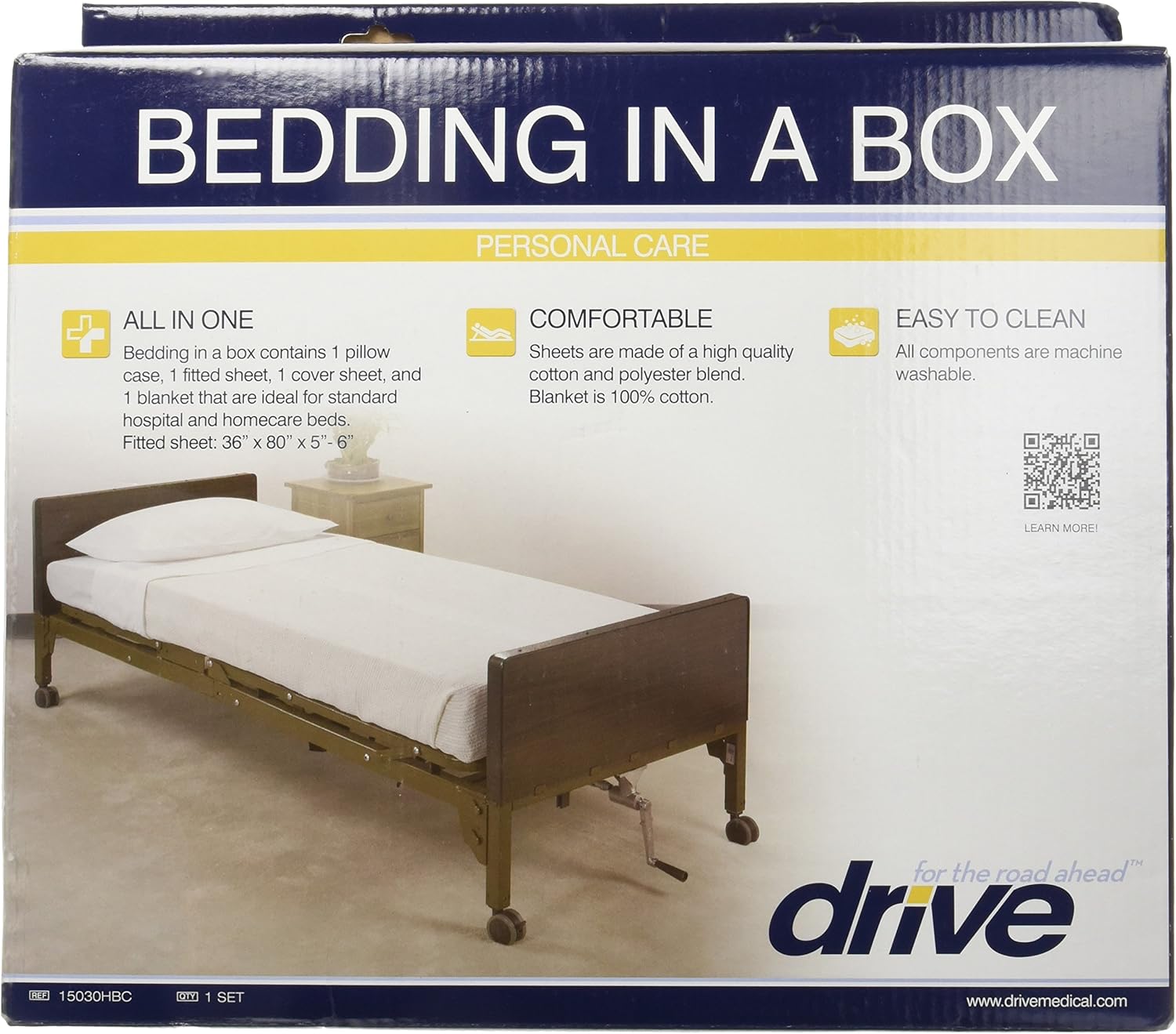 Drive Medical's Bedding in a Box set is perfect for use with most standard manual, semi-electric, and full electric hospital beds. The hospital bed sheet set includes a fitted bottom sheet, a top sheet, a pillowcase, and blanket — all constructed from a cotton/polyester blend, along with a 100% cotton thermal blanket. The hospital bed sheets and blanket are comfortable and machine washable.