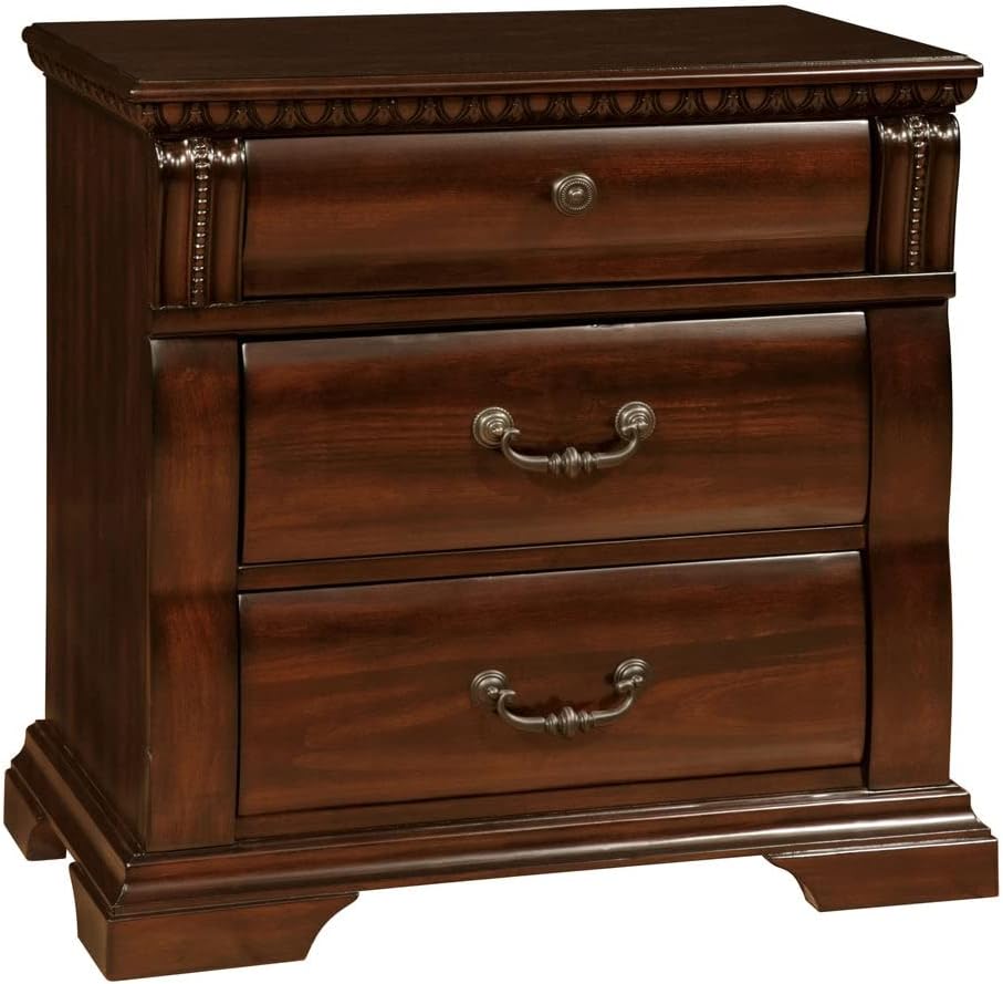 Items in 4 piece set include: 1 Queen Size Bed, 1 Dresser, 1 Mirror, 1 Nightstand. Georgeous wooden construction with decorative nuances gives this bedroom set a sophisticated air. Intricate trim on the headboard and large posts create a naturally pleasing yet bold appearance. Transitional, Cherry, Solid Wood, Wood Veneer, Others, Sturdy Decorative Bed Posts, Felt-Lined Top Drawers, Ball Bearing Metal Glides, Foundation Required