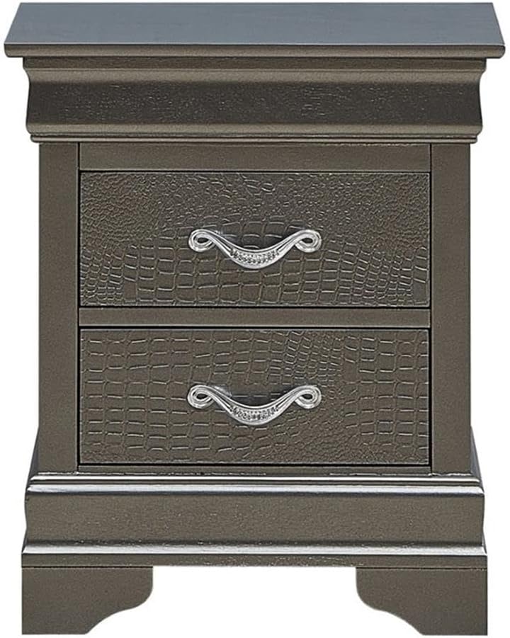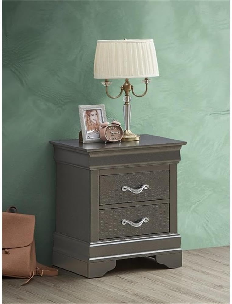 This modern transitional nightstand artfully marries functionality and style, making it an excellent addition to any bedroom or living space.Done in a sleek metallic black finish, it not only makes a striking visual statement but also brings resilience and durability for long-term use.At 24 inches high, 21 inches wide, and 16 inches deep, this nightstand is perfectly sized for limited areas, ensuring it fits seamlessly into your surroundings.With two spacious drawers, it provides essential storage for items like books, phone chargers, and personal belongings, helping you keep your space organized.Constructed to eliminate the hassle of assembly, it comes ready for immediate use, saving you time and effort.Its versatile color allows it to complement various furniture styles effortlessly, while the transitional design creates a harmonious blend with both contemporary and decors.Built with sturdiness in mind, this nightstand is designed for long-lasting enjoyment and practicality.