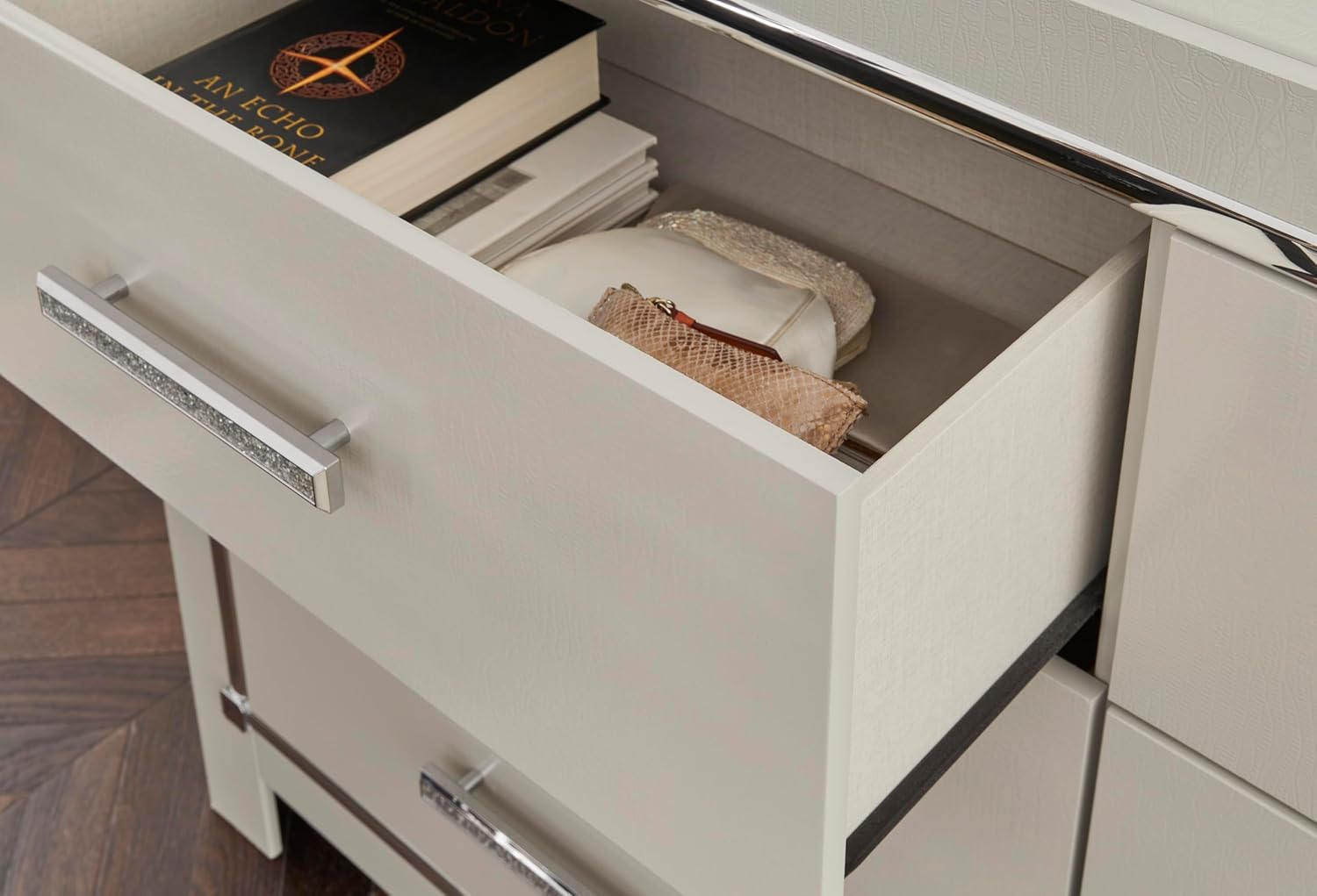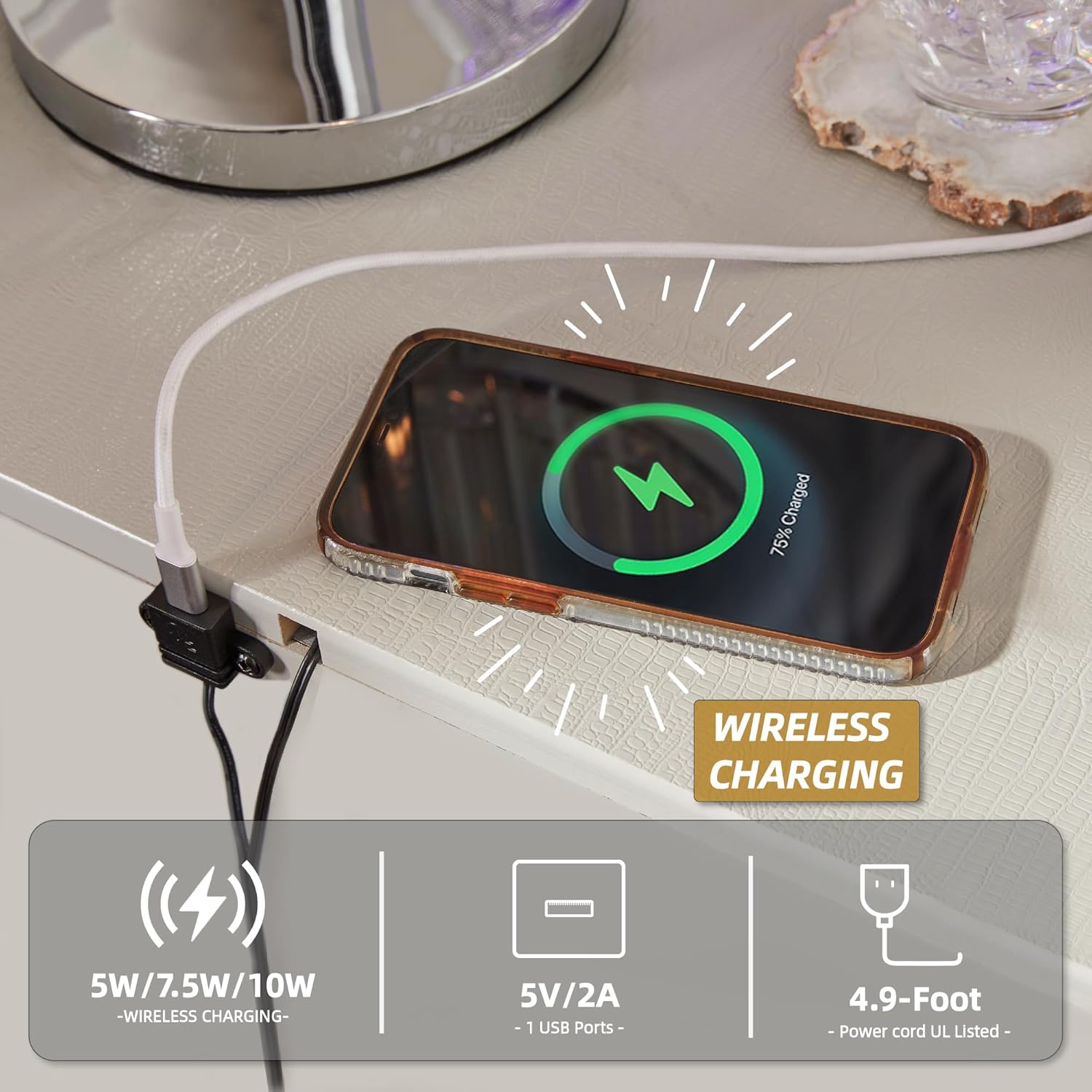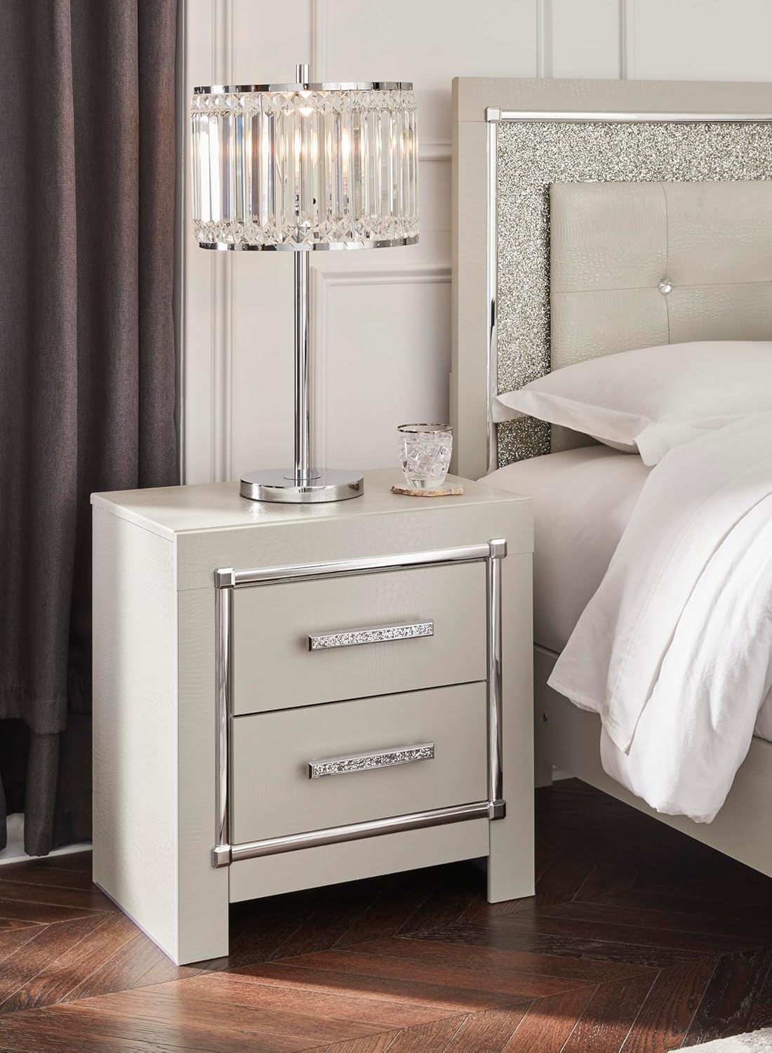 Bright, bold luxury. This nightstand dazzles with its attention to detail. Your love of glamorous style is reflected in its all-over faux gator in a metallic finish, exquisitely paired with faceted chrome-tone details. Complete with wireless and USB charging, it inspires you to live luxuriously every day—whether you're charging up to go out or scrolling on socials before bed. Signature Design by Ashley is a registered trademark of Ashley Furniture Industries, Inc.
