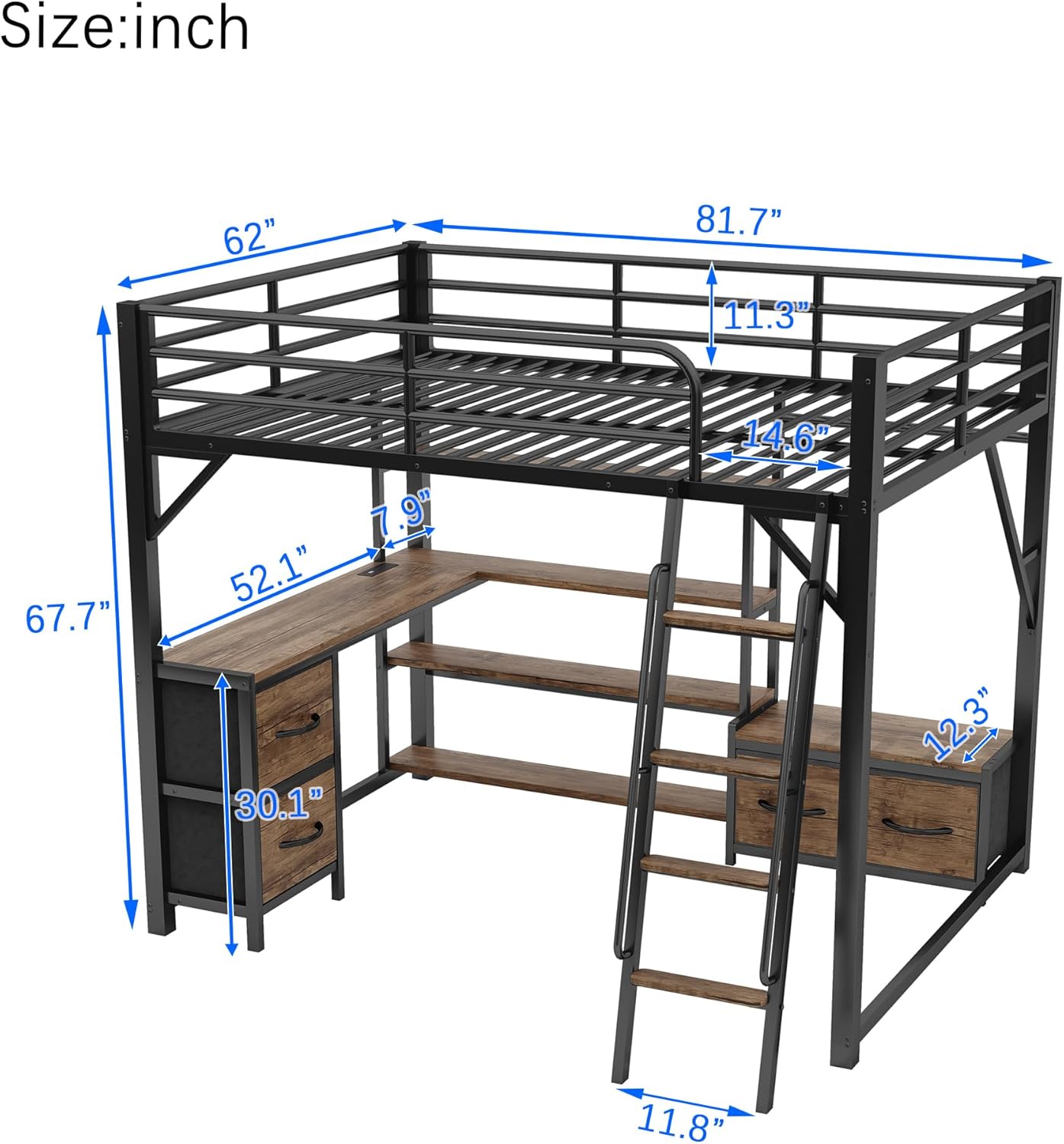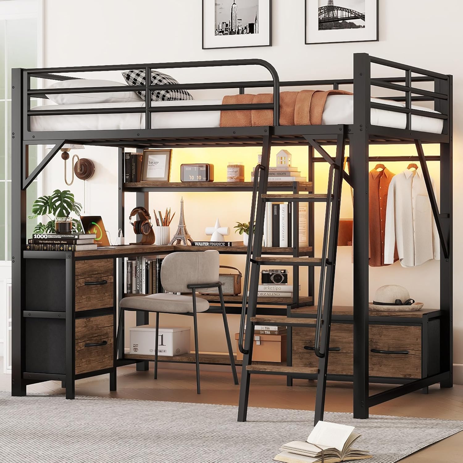 Queen Size Loft Bed with Desk and LED Lights & Charging Station, Metal Loft Beds with Storage Shelves and Storage DrawersThe innovative design of this loft bed maximizes the use of space in your bedroom. By combining a bed, desk, storage shelves, wardrobe, and drawers into one unit, make this queen loft bed more function and make the most of limited space It. is an ideal choice for small bedrooms or apartments where space efficiency is crucial.