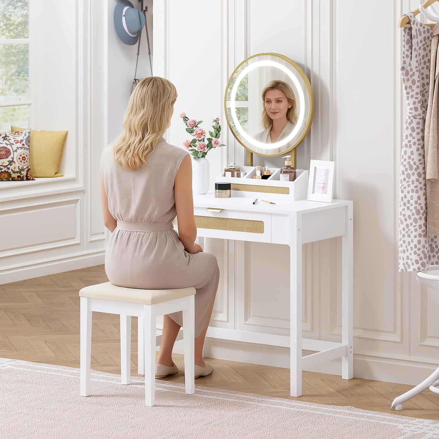 Upgrade your space with this white rattan vanity desk with mirror and lights, featuring a simple yet elegant coastal style. The sleek white body is beautifully accented with rattan panels, golden handles, and a golden LED mirror frame—creating a chic and timeless look that enhances any bedroom or dressing area. This makeup vanity set perfectly combines style and function, making it a must-have for modern homes. Designed for both beauty and organization, this makeup vanity with storage includes a spacious tabletop with 3 open compartments, a large bottom drawer, and a golden blow dryer holder on the side. From cosmetics to jewelry, skincare, and hair tools, everything has its place—keeping your room tidy and clutter-free. This vanity desk with drawers makes your daily routine effortless and organized. The highlight of this vanity set with mirror and stool is the high-sensitivity LED mirror. Equipped with 3-color lighting modes—warm, natural, and bright—it provides adjustable brightness for flawless makeup application, selfies, or skincare routines. With a smart touch switch, this vanity mirror with lights offers convenience and a professional beauty experience right at home. Product Specifications Vanity Desk Size: 29"L x 17.7"W x 54"H Stool Size: 14.3"L x 11.8"W x 17.4"H Weight Capacity: Desk top – 80 lbs; Stool – 150 lbs; Drawer – 25 lbs Product Weight: 41 lbs
