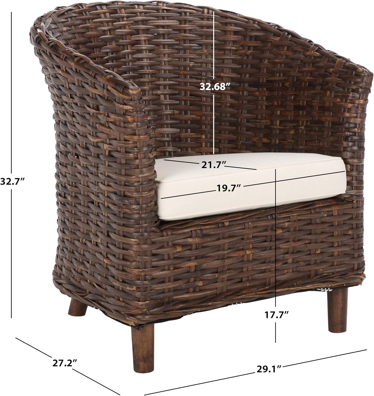 It's a wrap. Surround yourself with the comfort and transitional style of the woven rattan Safavieh Home Collection Omni Brown Barrel Chair. Crafted with mango wood and rattan in a brown glaze finish with upholstered poly-cotton seat cushion, it's the perfect place to dream the day away with a good book. Assembly required, these chairs measure 29.1" x 27.2" x 32.7".