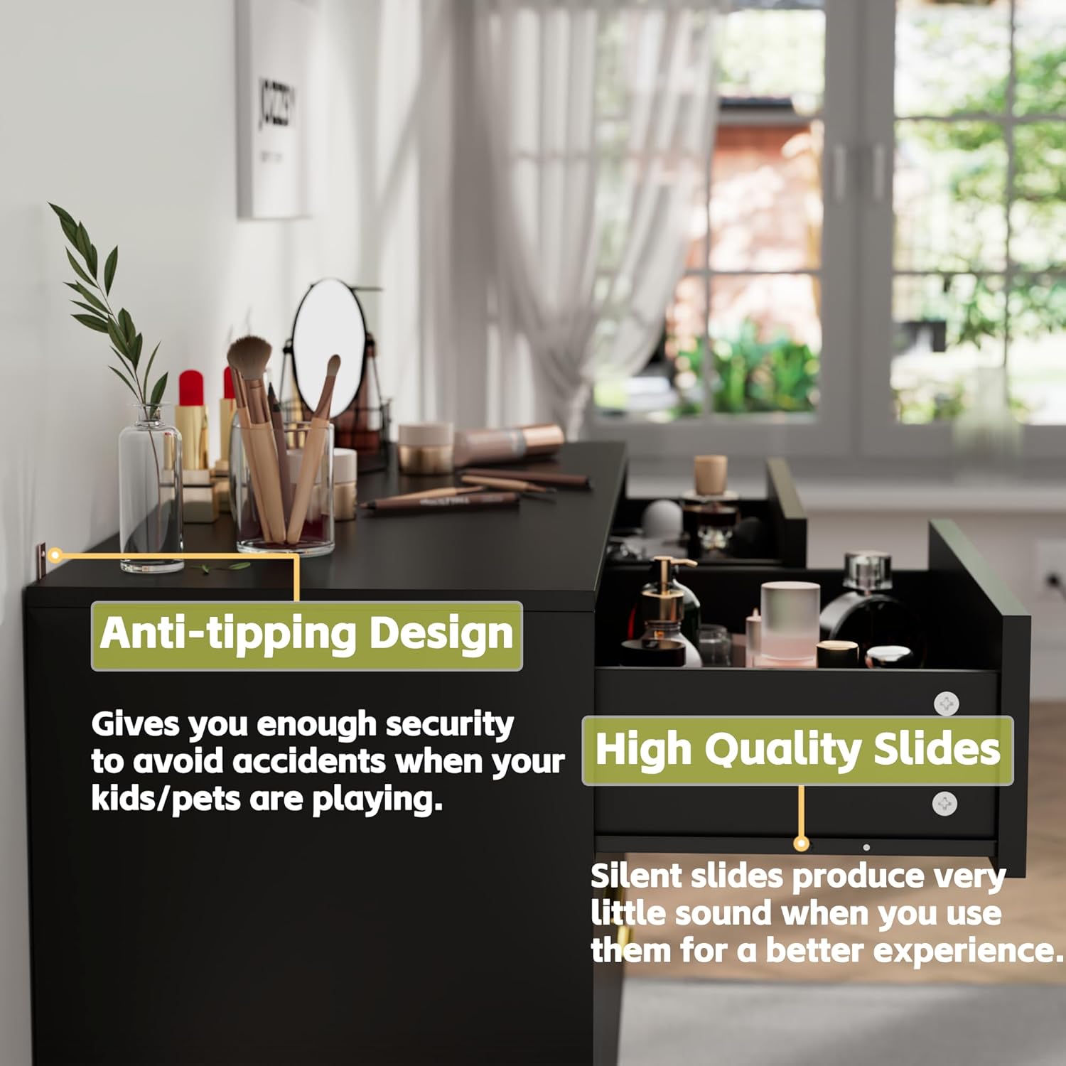 This dresser is the perfect solution to save space and store scattered and small gadgets and it is delicate design with beautiful appearance, and gives color to your life, made of high quality particle board material, durable and non-toxic for you daily use. It features 6 drawers that open smoothly, revealing ample space to tuck away spare linens, shirts, pants, and other wardrobe must-haves. The top leaves plenty of room to turn it into vanity and add a mirror, or display a table lamp and some framed photos. Features: This drawer dresser is made of high quality material Elegant, fine workmanship, beautiful and fashion Drawers are easy to glide and pulled in It is a perfect gift for someone special or treats for you Simple design makes this drawer dresser a perfect decoration for your home It is suitable for indoor use, likes family room, bedroom and living room Specifications: Material: Particle Board Color: Black Overall Dimensions: 47.24"(L) x 15.75"(D) x 30.71"(H) Drawer Dimensions: 22.83"(L) x 12.2"(D) x 7.48"(H) Load Capacity : 100 lbs / 25 lbs Number of Drawers: 6 Pcs Comes In One Box Packed in a single box with an approximate weight of 84lbs for your convenience. The less bulky packaging also means it will fit into any door and could be easily taken into your home, even when the space is limited. The packaging also fits nicely at the back of your vehicle so moving it to another office, apartment, or house becomes uncomplicated. Package Includes: 1 x 6-Drawer Dresser 6 x Handles 1x Instruction 1x Screw Fittings