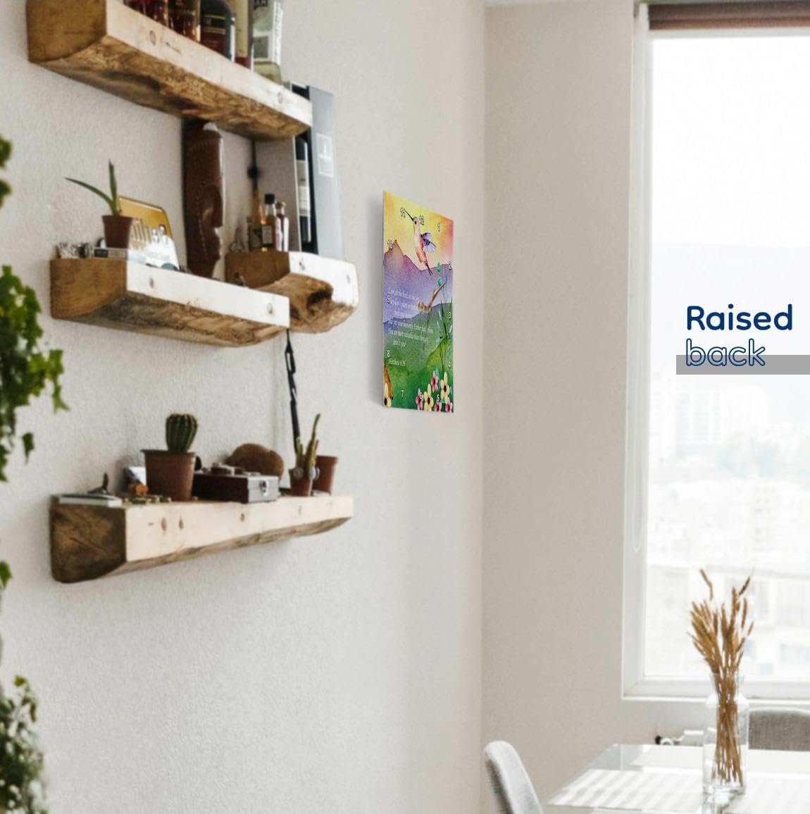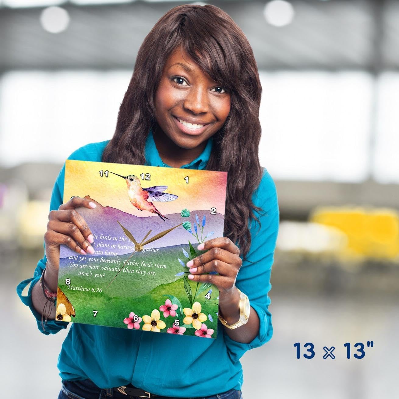 A decorative large picture wall clock is a wonderful complement to any room's decor in your home or office. Whether you are looking to match your rustic farmhouse décor or a modern boho style furnishing, we have thousands of contemporary and vintage art styles from which to choose. Decorate your kitchen bathroom bedroom or living room with a unique clock with a bird, beach, cat or even a sage green nautical ocean scene. The ideal birthday or holiday novelty gift for your loved one, chose a clock with a photograph that suits their taste. Numbers are printed in white with a black border as part of the image for easy viewing. Our durable high-grade aluminum is even suitable for a moist environment like a covered outdoor patio.The battery operated no ticking quartz technology will delight teen kids and adults alike. The photo clocks are square with no frame, available in sizes ranging from 10" x 10" to 15" x 15". Requires one AA battery in the uncovered battery box, not included. Made in USA.