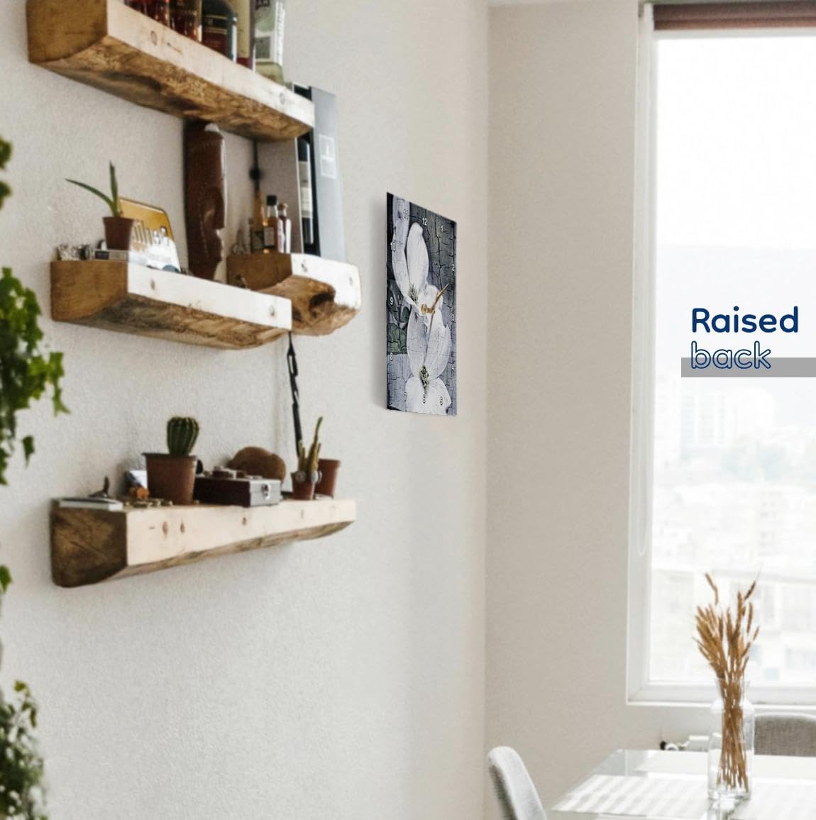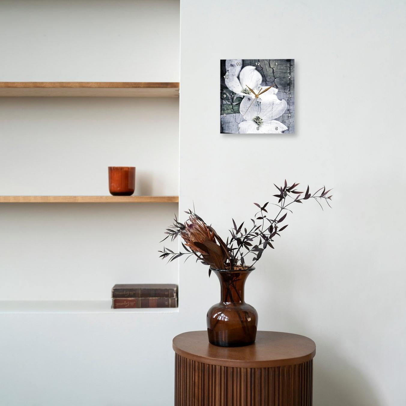 Crackled white Dogwood flowers - vintage inspired floral wall clock is a wonderful complement to any room in your home or office. Made of durable high grade aluminum. This frameless clock has a high gloss mirror like, UV coated, scratch resistant finish and is suitable for a moist environment. Sizes available range from 10x 10to 15x 15. Requires one AA battery; not included. Battery box is not covered.