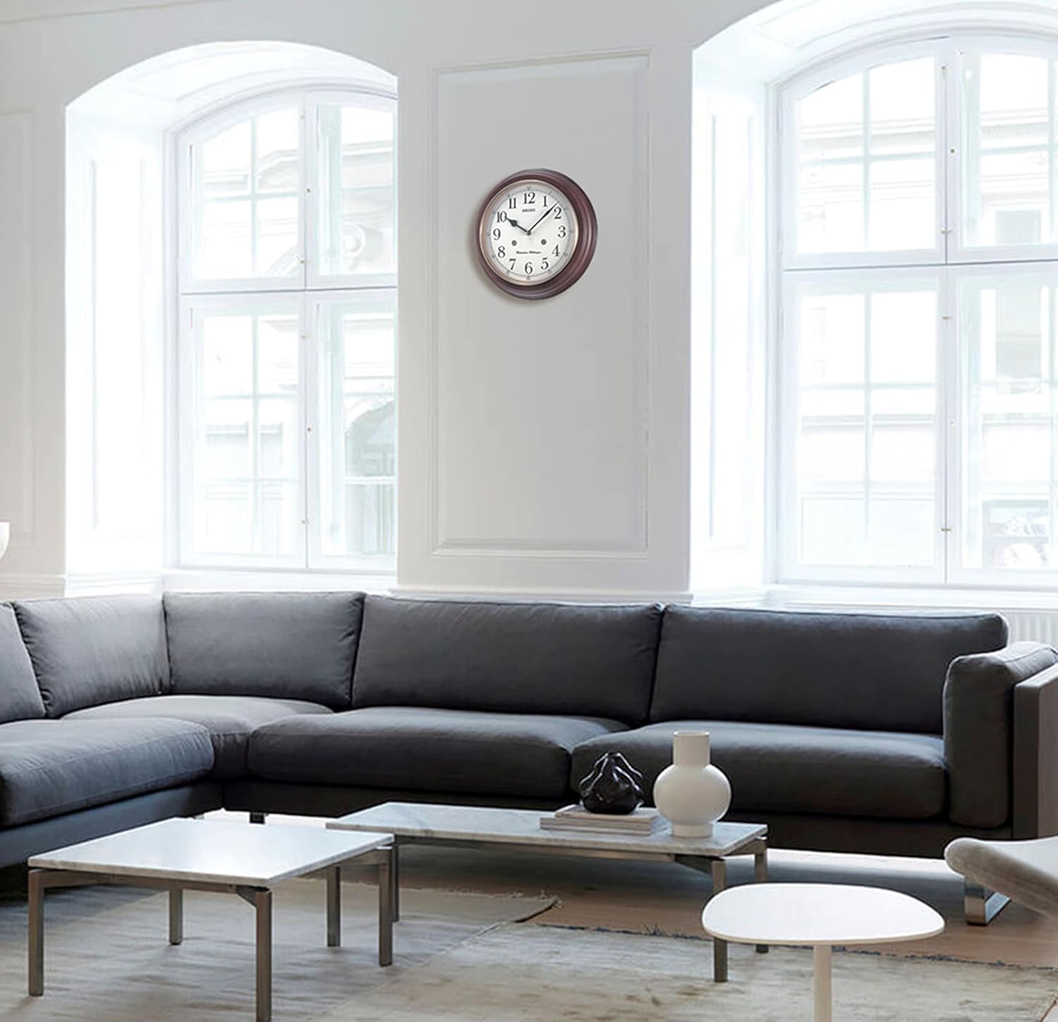 This round wall clock brings warmth and sophistication to the home as well as office space. Classically designed, it features a brown case with a wood grain finish, crystal glass, and a quiet sweep second hand. Powered by 1 C battery (included). Overall dimensions 12. 3 X 2. 4 inches.