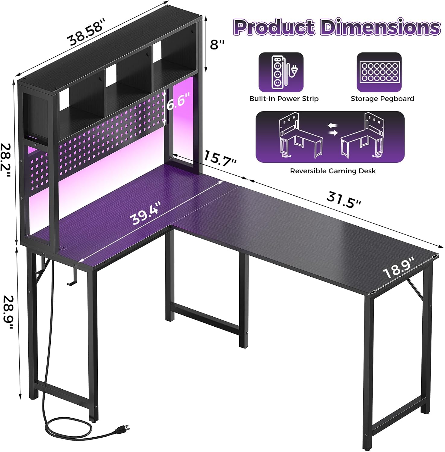 L Shaped Gaming Desk with Shelves & Led Lights, 47 Inch Small L-Shaped Corner Gaming Desk Black with Storage for Small Space, Reversible Computer PC Table with Hutch Pegboard for him Bedroom, Boys