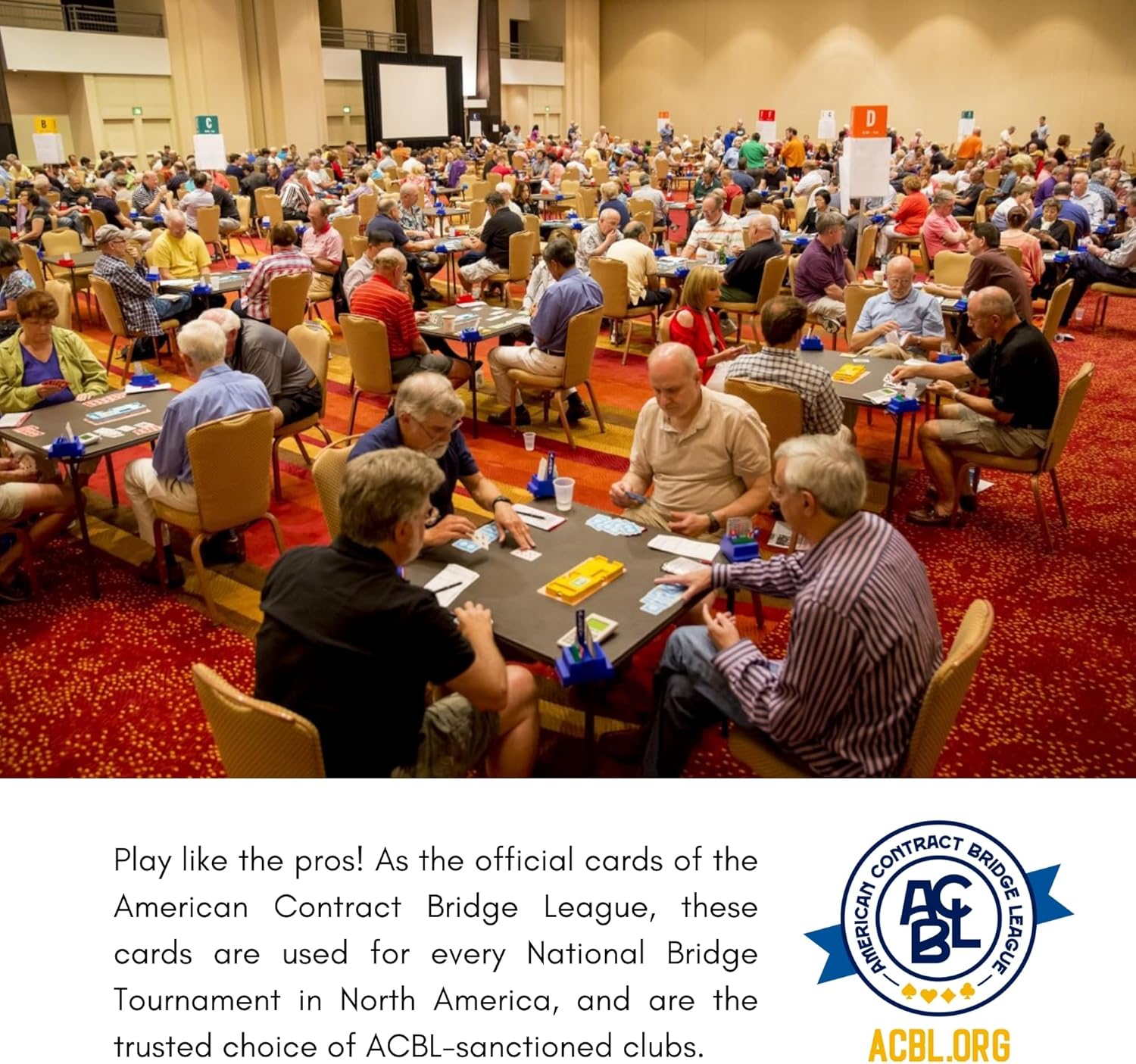 Enjoy the same trusted cards used in every ACBL-sanctioned club and tournament! These high-quality, plastic-coated bridge cards feature the official ACBL logo in six bright colors. Each bridge-size deck comes in a clear cellophane wrap for compact, easy storage. With jumbo index for superior readability, these cards are perfect for duplicate clubs, tournaments, or home games. Designed to run smoothly through dealing machines and fit all duplicate boards, they’re durable, reliable, and an excellent value for every player.