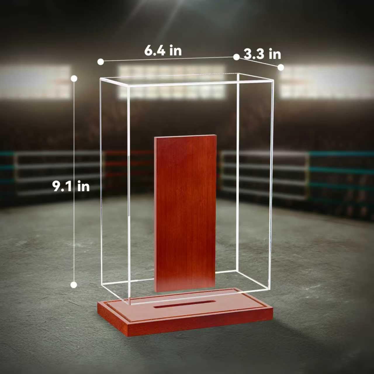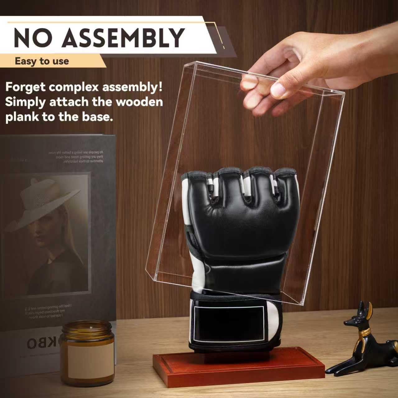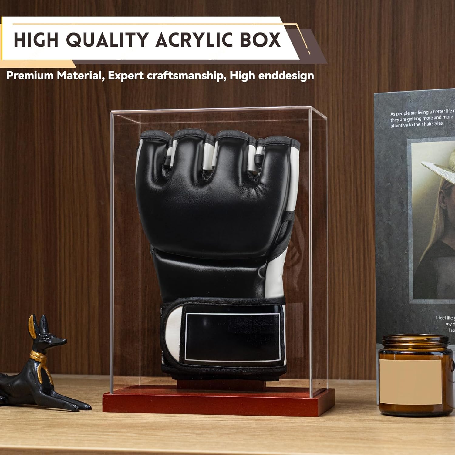 MMA Glove Display Case No Assembly!! Note: Please check the size of your souvenir before purchasing. Gloves not included Single holder. Size: Interior dimensions are 9.1 x 3.3 x 6.4 inches Easy setup: Say goodbye to complicated assembly! Simply attach the wooden board to the base. Your boxing gloves will be displayed at the perfect angle for a stunning display. Our display boxes can display your gloves, sports collectible souvenirs, figurines, dolls, models and more, it is a good choice for giving to collectors and displaying souvenirs. Dust-proof: Use our glove souvenir display box to effectively prevent dust and moisture, protecting your collection to always maintain its beautiful appearance.
