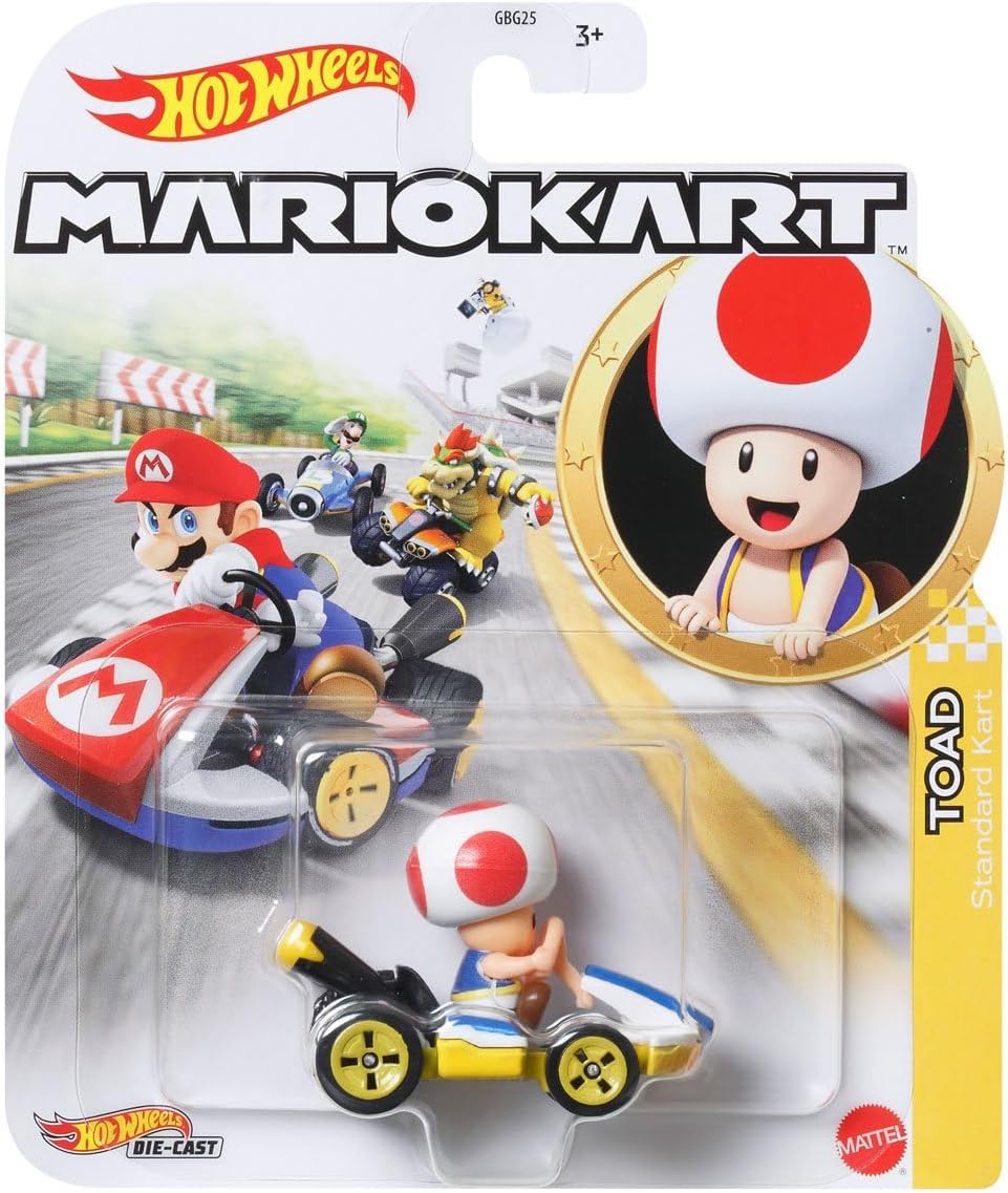 Bring the excitement of Mario Kart racing to life with this fantastic Hot Wheels die-cast character cars collection! This 6-pack bundle features beloved Nintendo characters transformed into uniquely designed vehicles. The collection includes Toad in his sporty yellow racer, Princess Peach's elegant roadster, Yoshi's distinctive green machine, Donkey Kong's powerful ride, Koopa Troopa's classic cruiser, and Shy Guy's speedy cart. Each die-cast car captures the personality and style of its character with authentic details and premium finishing. These collectible vehicles are perfect for both play and display, combining Hot Wheels' legendary quality with Mario Kart's iconic charm. The cars are built to last with die-cast metal construction and feature rolling wheels for racing action. Whether you're a Mario Kart fan, Hot Wheels collector, or both, this set offers endless entertainment possibilities. Suitable for ages 3 and up.