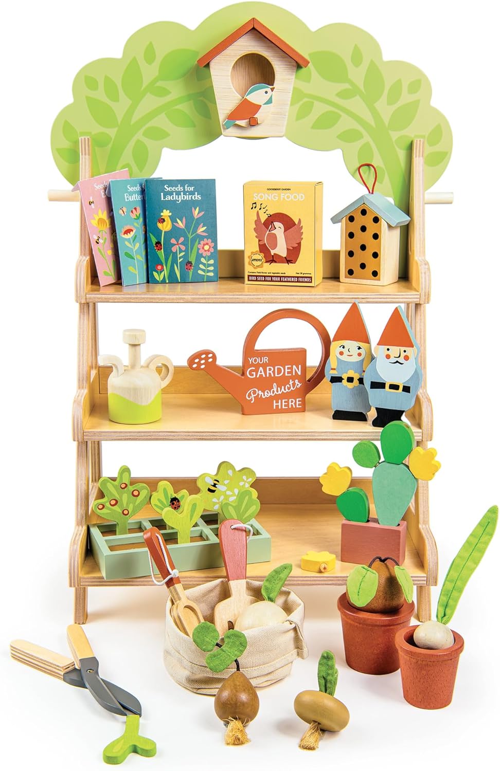 TEND, GROW, EXPLORE! This charming garden stand is packed with all the essentials for budding gardeners! With 3 shelves and 3 pegs to display your gardening treasures, this set includes a trowel, fork, and garden shears to dig, chop, and trim to your heart’s content. You’ll also find a birdhouse with a cheeky blue tit, an insect box, and a tray of seedlings ready to be planted. But wait - there's more! You'll be planting, watering, and nurturing with a watering can, sprayer, and two adorable terracotta-style pots. And don’t forget the bag of 5 fabric and wood bulbs to plant and watch grow into something special! For extra fun, meet Mr. and Mrs. Gnome, who are always up for a good garden chat! Plus, there’s a bird seed box to make up and 3 seed packets to fill with all the seeds you’ve gathered during your outdoor adventures. This garden centre is great for pretend play, sparking social interactions, and boosting language skills as little gardeners chat about their blooms and garden friends. It’s a budding superstar for imaginative play and will help your child develop fine motor skills while planting, watering, and organizing their garden treasures. Get ready to grow your playtime with endless possibilities!