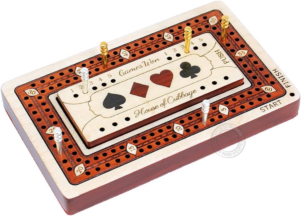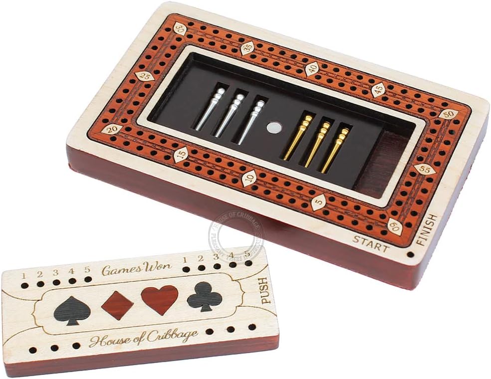 House of Cribbage presents 2 track (60 Points) Wooden Travel / Pocket Size non continuous cribbage board made for up to 2 players. The board measures (L x B) 4" x 2.5" and can be used to play games between a pair of players. Six brass crib pegs (3 Gold & 3 Silver plated) are provided with the board. The top part of the board has a very beautiful magnetic push lid to store six metal crib pegs. There are 6 slots inside the push lid and each slot holds single peg. The magnet on the back of lid holds the lid tightly when it is closed. The complete board has three coats of catalyzed lacquer in satin finish that provides protection from spills and general wear & tear. The handmade cribbage board has been inlaid in Maple wood and Bloodwood. Bloodwood is a natural dark red color wood and maple wood is always in natural white color. The bottom of the board has 4 balancing feet which protects the board from scratches and enhances the stability of the board. Free leatherette case is provided to protect the board. Playing Cards Storage Option - No Playing cards storage provided. Playing cards are not provided with the board.We don't use any screen prints or paints to create numbers or tracks on cribbage board. Designed and crafted by Pleasant Times Industries. All designs, images, concepts, and content is copyright and owned by Pleasant Times Industries