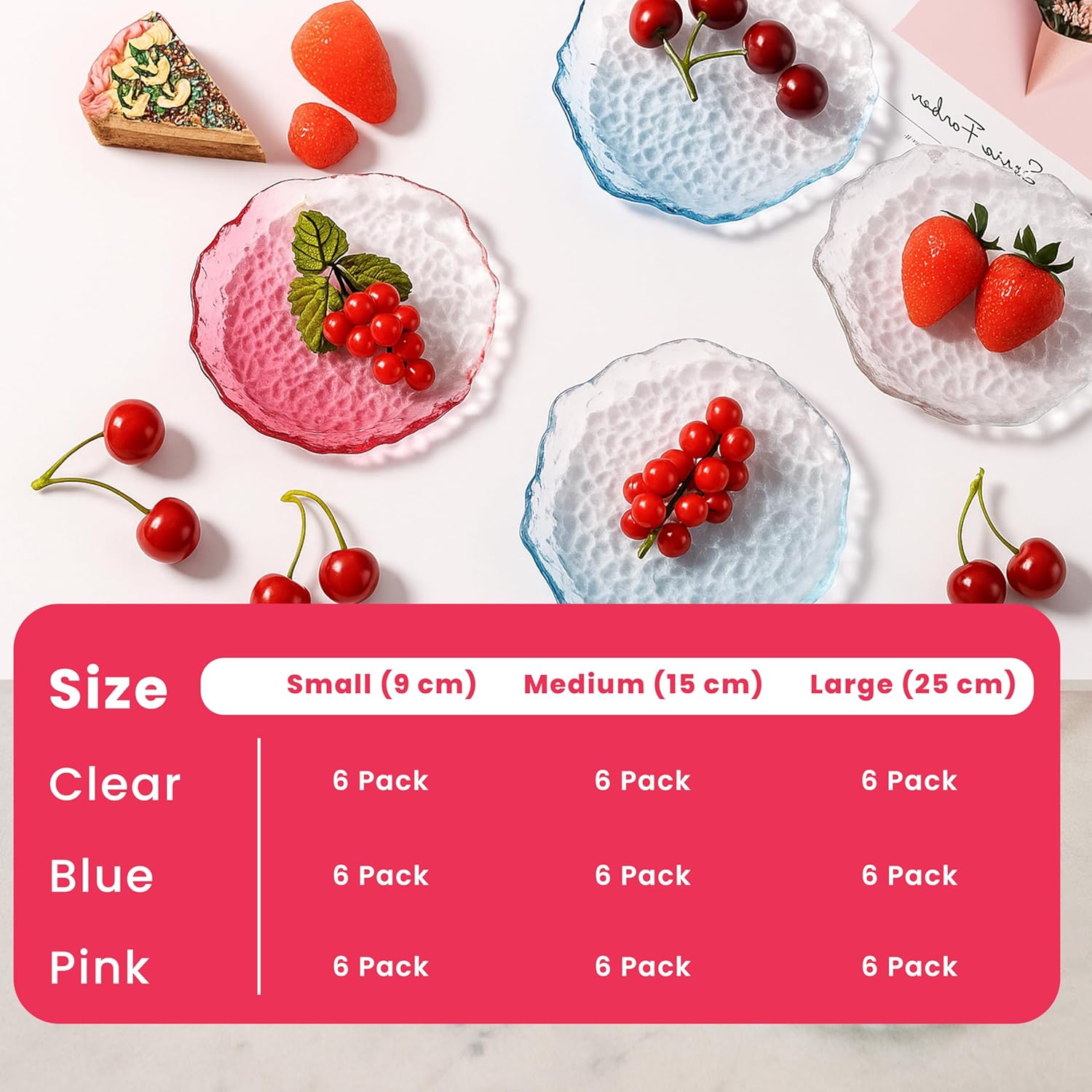 • Variety of Sizes & Styles – Available as 3.5in/9cm small dessert plates set, 5.9in/15cm medium appetizer plates set, or 10in/25cm large dinner plates set, these decorative glass plates set options suit every table theme. Choose clear glass dessert plates, blue or pink hammered glass plates to match your artistic glass dinnerware collection.