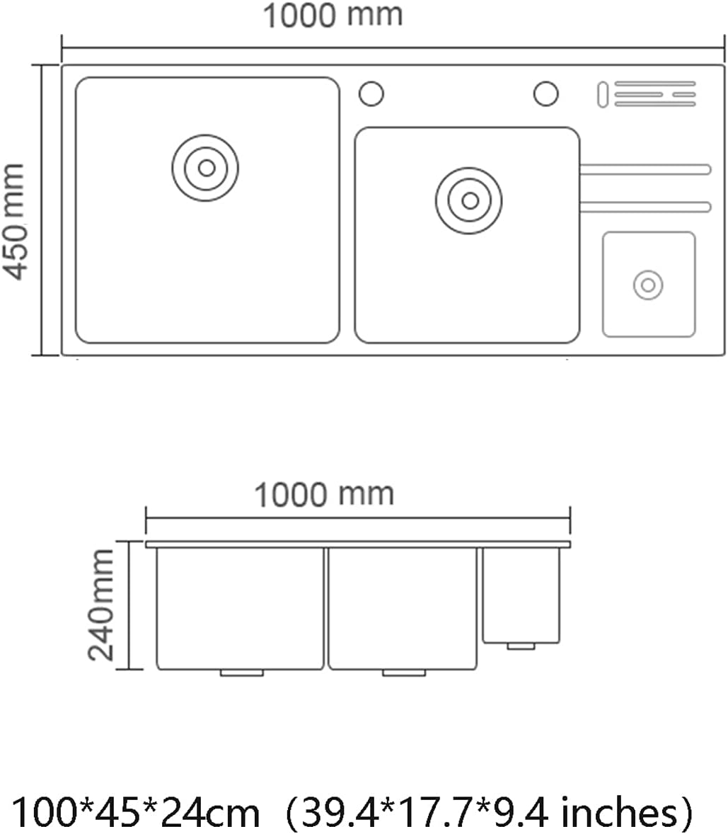 Kitchen sink, made of SUS304 stainless steel, brushed surface, smooth, easy to clean, smooth corners and hand-polished edges, sink with freezer plate, can be used to quickly defrost frozen food, at the same time with embedded knife holder, hidden cover Trash cans can be used in kitchens, balconies, garages, RVs, workbenches, etc. Product name: kitchen sink Material: 304 stainless steel Applicable scenarios: kitchen, balcony, garage, workbench Shape: rectangle Colour: Black Size: 100*45*24cm (39.4*17.7*9.4 inches) Packing: A-sink, drainage set, grid basket, knife holder, trash can, B-sink, drain set, grid basket, knife holder, trash can, faucet, inlet pipe, angle valve. Precautions We only sell sinks (please check the pictures for detailed accessories), and the rest are props. We have many similar products, please click to enter our store, we will show better works.