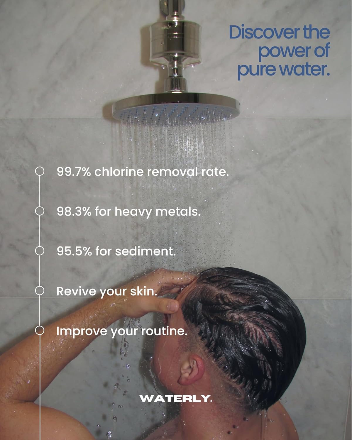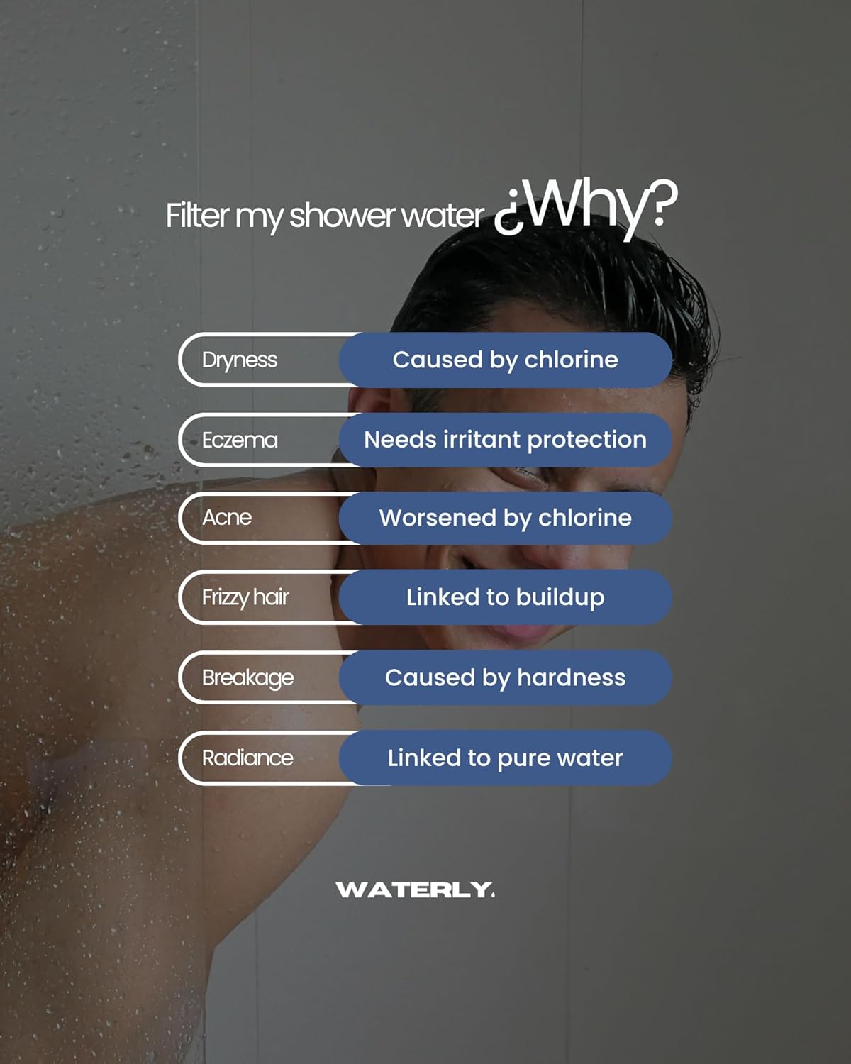 Transform your shower routine with the Waterly shower filter, designed to improve water quality and care for your skin and hair from the very first use. Its high-performance filtration cartridge removes chlorine, heavy metals, sediment and other common contaminants, leaving water softer, cleaner, and healthier. Ideal for people with sensitive skin, acne, dry scalp or brittle hair; even for babies. The sleek design easily fits any standard shower, no tools required. WATERLY is a practical, aesthetic and effective solution for more conscious and healthy personal care.