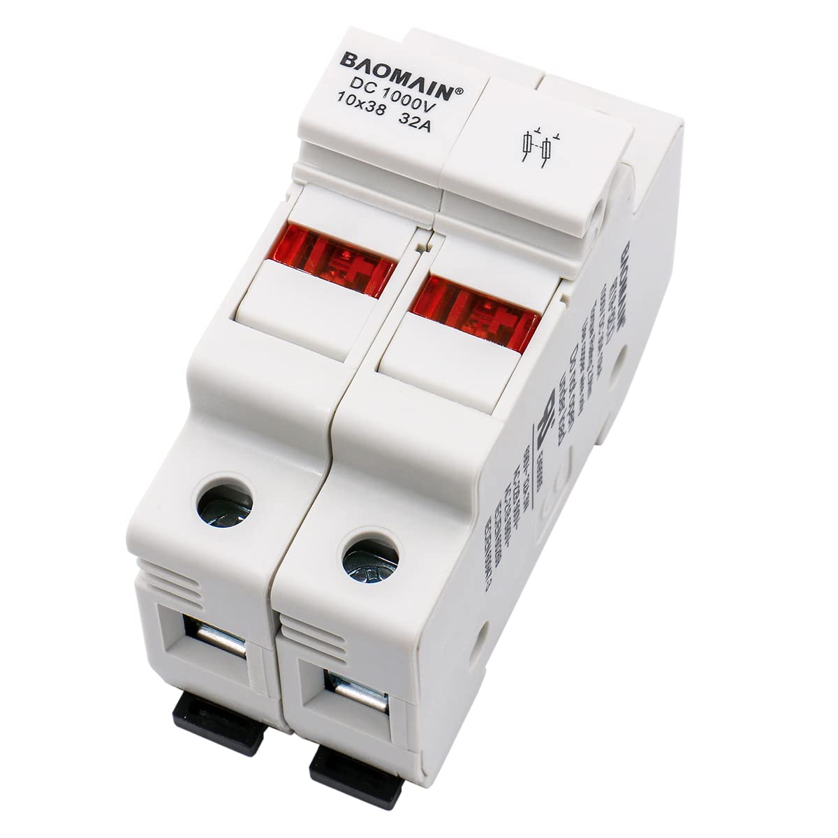 Baomain RT18-32(X) 1000VDC Solar Fuse Holder,DIN Rail Fuse Holder (RT18-32 Compatible) Reliable Circuit Protection for Industrial & Household Use This 2-pole cylindrical fuse holder is designed for RT18-32 fuses (10x38mm, not included), providing effective overload and short-circuit protection in electrical systems. With a 32A, 1000VDC rating, it is suitable for industrial control panels, machinery, and household appliances. Unlike standard AC fuse holders, this PV-rated version features:Higher dielectric strength for DC arcingPolarized terminal designEnhanced creepage distancesKey Features:1000VDC/32A Rating - Meets high-voltage demands of modern solar arraysCopper Alloy Terminals - Low resistance contacts minimize power loss in DC circuitsTool-Free Cover - Hinged design allows safe fuse replacement in energized solar cabinets (recommend de-energizing) Secure & Convenient Wiring Featuring a tunnel-type terminal block, this fuse holder ensures fast, stable wiring with high conductivity. The 35mm DIN rail mount allows for easy installation in electrical cabinets, while the flip-open cover simplifies fuse replacement. Enhanced Safety & Durability Constructed with flame-retardant ABS plastic and copper terminals, this fuse holder resists high temperatures and ensures long-term reliability. The red LED indicator provides clear visual feedback when a fuse blows, improving safety and maintenance efficiency. It is available in two configurations (1P, 2P) to fit different application needs. Certified Quality Certified to international safety standards: Safety:Certified to UL Recognized (UR) and CE standardsChina Standards: GB13539.1/GB13539.2/GB13539.6 (fuse standards), GB14048.3 (switchgear)International Standards: IEC269-1/IEC269-2 (fuses), IEC947-3 (low-voltage equipment) Package Includes: 6 x 2-pole fuse holder (RT18-32 fuse not included). Designed for demanding applications including: Primary Application: Solar PV systems (1000VDC/30A) Secondary Applications:Industrial control panels (motor circuits, PLC systems, power distribution)Building automation systemsHVAC equipment and appliance power management Technical SpecificationsElectrical Rating:1000VDC/30A (Solar PV, IEC 60269-6) 690VAC/32A (Industrial, IEC 60947-3)Breaking Capacity:10kAPower Consumption:Max. 3W power consumptionTerminal Torque:2.5NmWire Compatibility: 18 to 8 AWG cablesNote: For DC applications: Use with PV-rated fuses per IEC 60269-6AC applications: Follow IEC 60269-1 guidelinesFor qualified electricians onlyVerify fuse compatibility before installationEnsure the system is fully de-energized before installation.Consult local electrical codes before installation.
