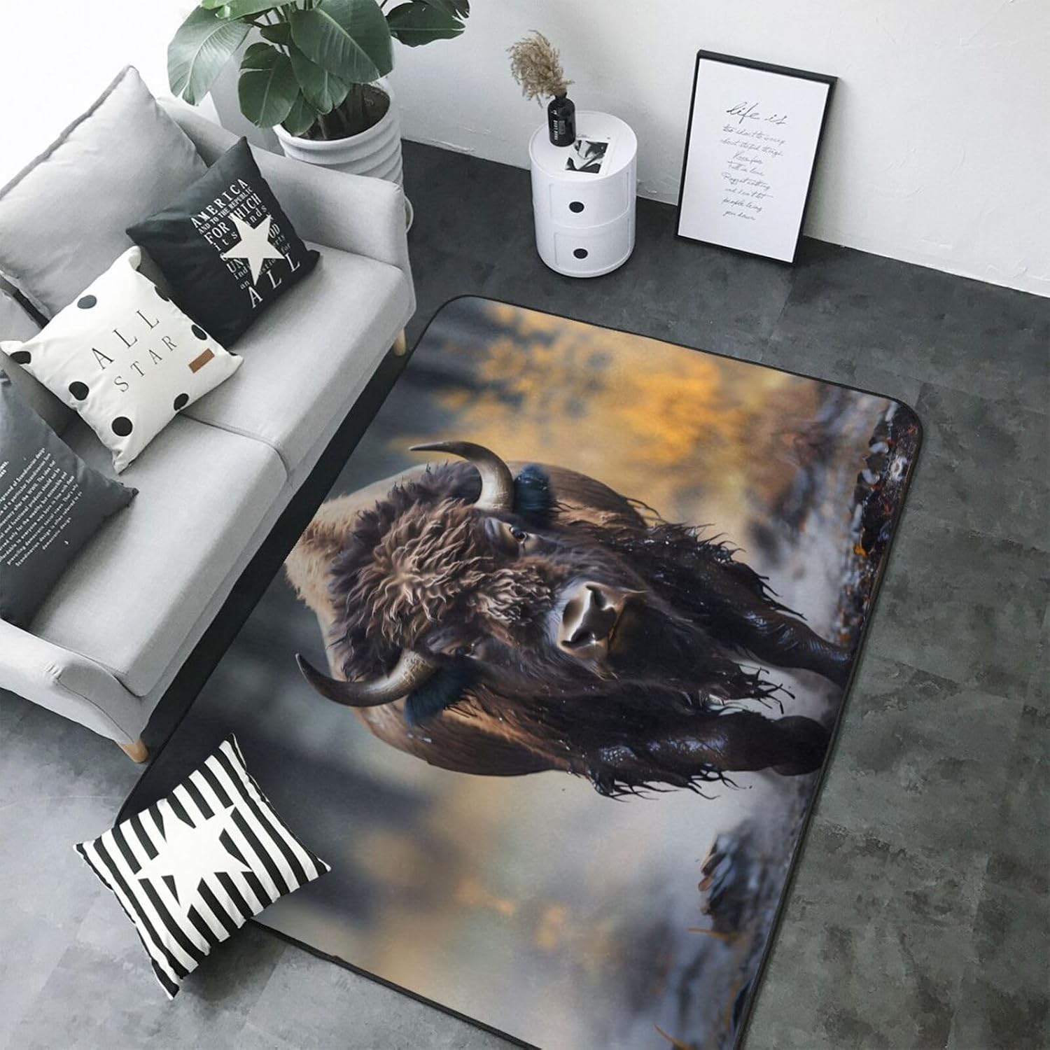 Choose our North American bison printed decorative carpet to bring meticulous care to your family. Made of high-specification polyester flannel, the pile is fine and dense, not easy to pilling and fading, and it will accompany you longer. The memory foam middle layer is like a caring friend, dynamically adjusting the foot pressure, relieving fatigue, and making your every step full of comfort. The non-slip bottom design is like a loyal guardian, silently protecting the safety of you and your family, especially suitable for families with elderly and children. Easy to clean, can be washed by water or machine, saving time and effort. Exquisite cutting and sewing technology ensures that the edge of the carpet is flat and burr-free, and the truth is in the details. Whether it is a bathroom, bedroom or office, it can add a touch of warmth and peace of mind to your life.
