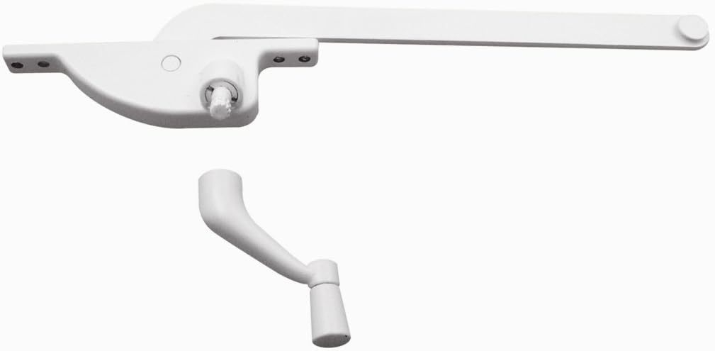 This Prime-Line H 3710 casement operator is constructed of a diecast housing and crank handle, with a 9 inch steel arm and a hardened steel worm gear mechanism. It features a square body and mounts on the left side of the window, when viewing the window from the inside looking out. This operator is used on older steel-framed casement windows, with a pair of mounting holes spaced at 3-7/8 inch and another at 4-3/4 inch on center. A crank handle and installation fasteners are included with this casement operator.