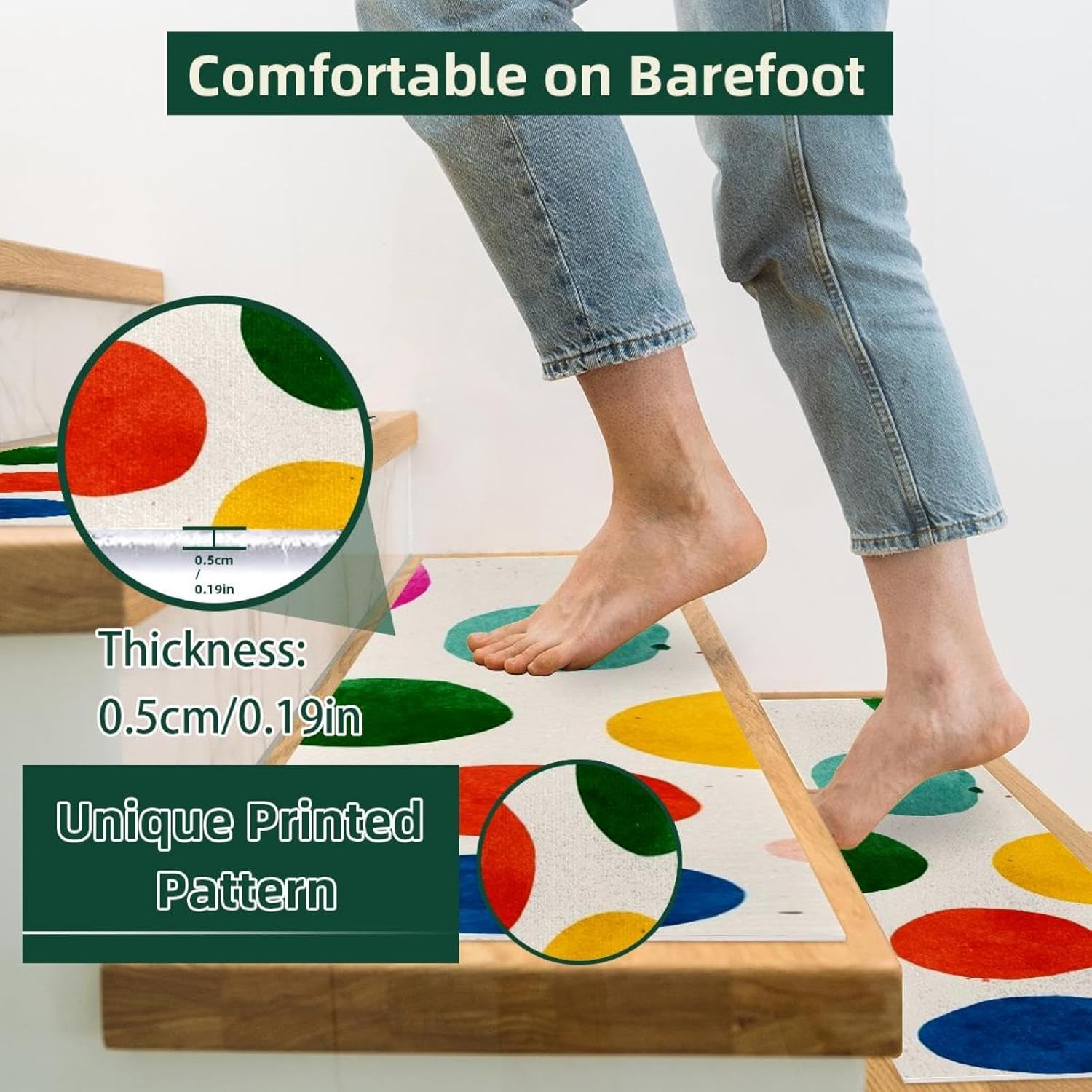 [Comfortable & Noise Reducing & Anti-slip]: 15-Piece Stair Treads Carpet is made of TPE base and polyester fiber, which make you feel soft and comfortable on barefoot. Proper thickness (0.5cm/0.19in) can reduce the noise generated, and provide you with a quiet and relaxing environment. They are an excellent choice for anti-slip protection. No crease, no curl, no fading. [Suitable for most staircase designs]:These anti slip carpet stair tread’s dimension is 30x8in/76x20cm, fits most indoor home stairs perfectly. The staircase runner carpet for stairs are safe and friendly for kids, elders and pets. [Washable & Reusable & Durable]: Step treads are durable and stain-resistant. Carpet stair treads are hand wash or machine wash. If you’d like to wash stair covers for carpeted stairs, wash in cold with mild detergent. These indoor stair treads are easy to clean and can be cleaned by vacuuming,sweeping,wiping,or machine washing. [Easy Installation]: Clean and dry your floor’s surface first; peel of the adhesive backing; place carpet strip right on the stair then press it; simply place stair carpet treads non-slip on your staircase and press indoor carpet stair treads; If you want to relocate or remove it without leaving any residue, Just peel and stick to stairs. [Widely Using]: Non-slip stairs runner to all smooth surfaces for the best traction and the perfect texture to make sure you and your surrounding are safe at all times! you can stick these Stair Treads for Wooden Steps, tile, metal, and glass stairs, Enjoy all-around protection and ultimate comfort in your home. [Holiday DESIGN]: :These interior decorative stair carpet treads are designed specifically for Christmas,Halloween, Thanksgiving Day features classic festival elements and vivid printing styles,creating beautiful and stunning visual effects for you. This holiday themed stair treads can easily help you add a strong festive atmosphere, bringing charming and exquisite holiday decorations.
