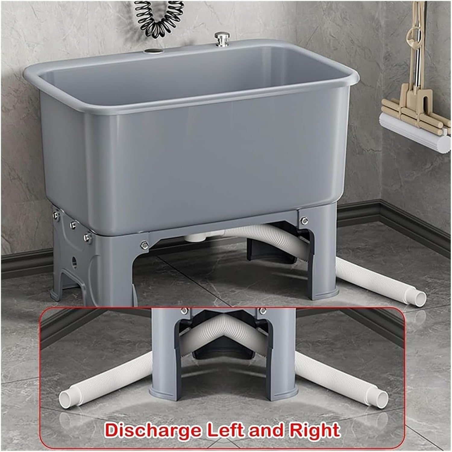 Portable Outdoor Mop Sink Station Suitable for a variety of environments, including bathrooms, balconies and other commercial spaces, this floor mop sink is perfect for cleaning work, floor cleaning and maintenance work. Its versatility makes it a practical addition to any cleaning tool? The thickened plastic mop sink is a reliable and practical solution for keeping your space clean. Whether it's a bathroom or a warehouse, this commercial mop sink can meet your needs. ? Strong load-bearing capacity is another key feature. The screw-fixed high feet and water tank, as well as the nut embedded design, provide stability and durability. The threads are not exposed, giving the sink a sleek and sophisticated appearance. This design ensures that the mop sink can withstand frequent use without any problems. ? The fast drainage design is essential for efficient cleaning. The curved edge and wide drain port of the commercial floor mop sink speed up drainage. This not only improves drainage efficiency, but also reduces the amount of water used to wash items. It effectively solves the drainage problem and makes your cleaning tasks easier? ? Product parameters: Product name: Floor mop sink Product material: Thickened PP Color options: Gray Dimensions: Pool width 60 cm/23.6 inches; Pool length 40 cm/15.7 inches; Total height: 46.5 cm/18.3 inches Pool height 27 cm/10.6 inches 19.5 cm/7.7 inches from the ground Scope of application: bathroom/balcony, garage, commercial places, etc. Installation method: floor-standing ? Packing list: 1 x mop sink mop sink Drain pipe 1m
