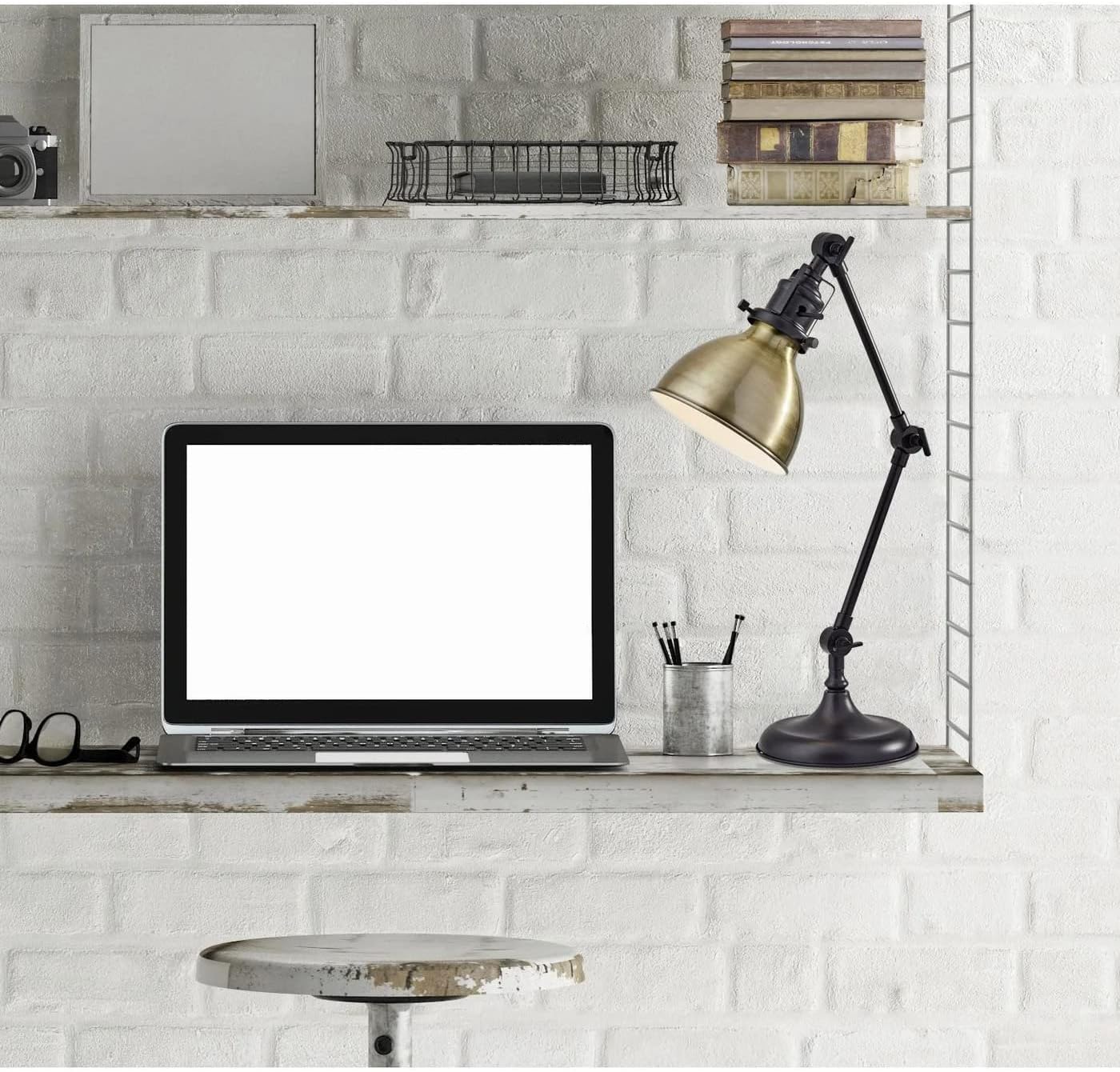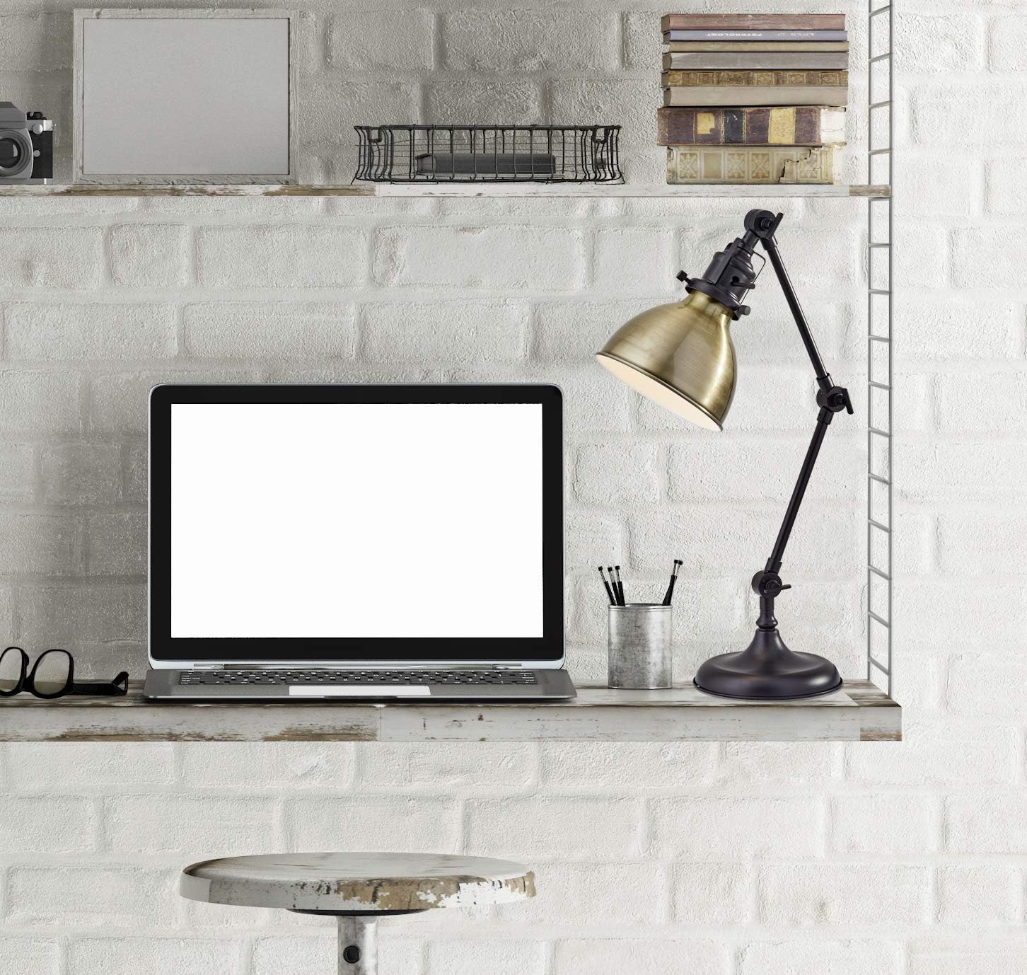 Light up your workspace in style with this Desk Lamp as it embraces industrial-style detailing on the shade cup and joints elevates the classic task silhouette. A dark bronze finish provides a beautiful contrast to a warm antique brass finished metal shade. With three adjustable joints, it is easy to direct the light exactly where it is needed. This tabletop light is compatible to work with the 40W standard and LED bulb.