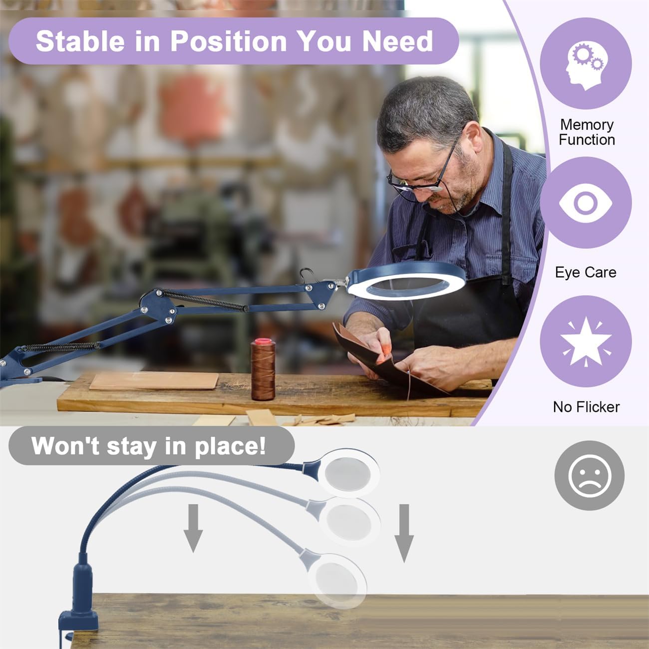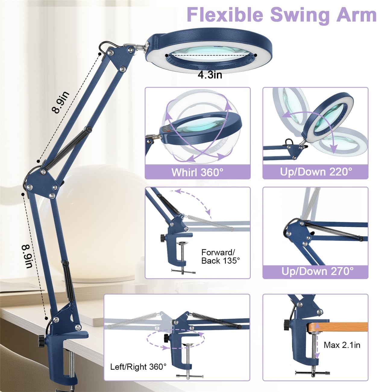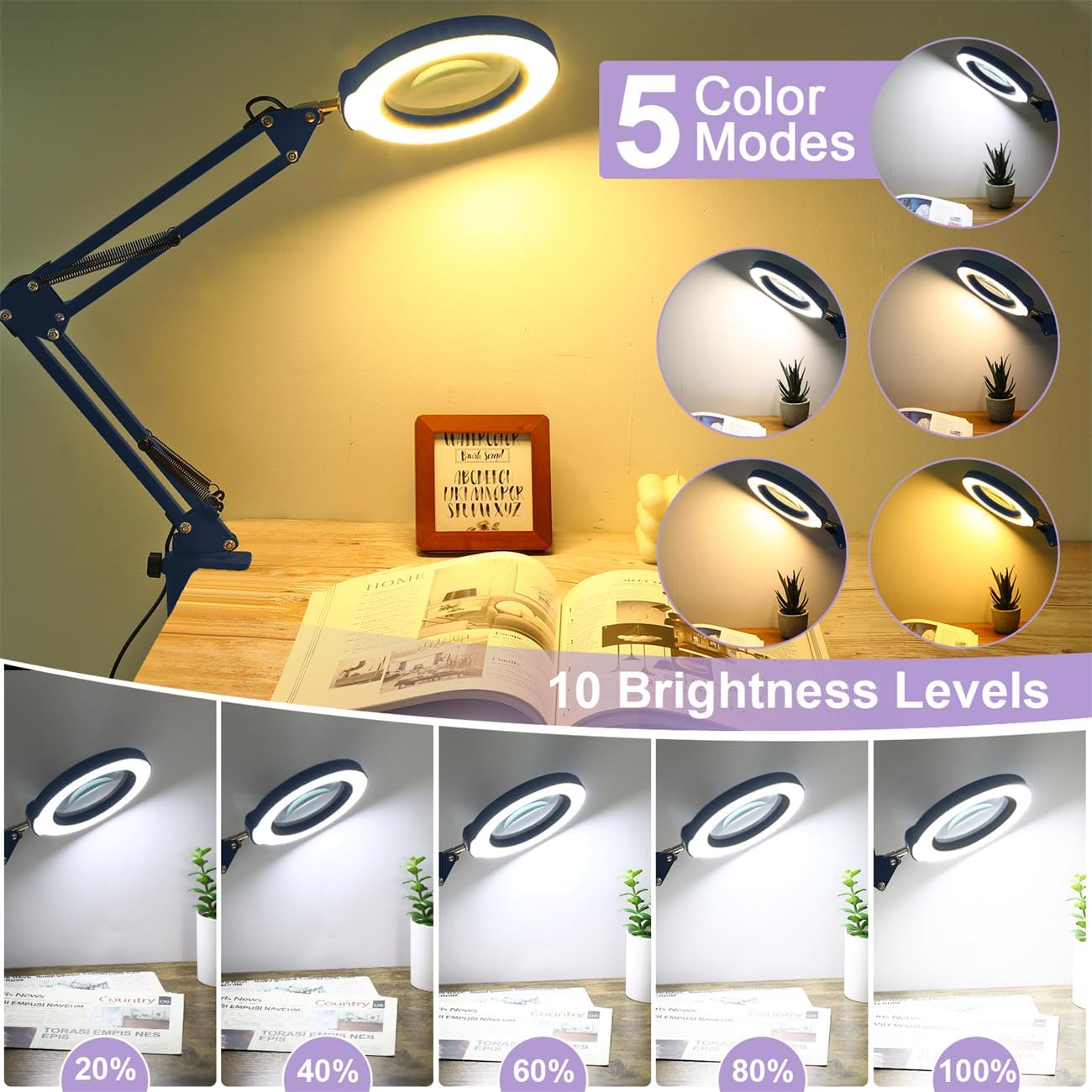 Hands-Free MagnificationThis magnifying glass with clips allows for hands-free use, making our table top magnifying glass perfect for tasks requiring precision. Simply attach it to your workstation, bench, or desk and enjoy the convenience of a standing, flexible, and adjustable holder.Crystal Clear Glass LensFeaturing a clear, high-quality glass lens, this diamond painting light ensures that you see every detail with exceptional clarity. Our standing magnifying glass is perfect for reading books, painting by number, and detailed work by artists, crafters, and estheticians.Bright LED LightingEquipped with bright LED lights, this sewing light provides ample illumination for any task. The adjustable and swivel light ensures that your work area is always well-lit, whether you're doing makeup, numismatic research, or pedicures.Adjustable Color TemperatureThe LED lights come with adjustable color temperature settings, allowing you to customize the lighting to suit your needs. This feature is particularly useful for elderly individuals or older parents who require different lighting conditions for various tasks.Versatile and FlexibleWith its retractable, telescopic extension arm, this magnifying glasses with light for close work is highly versatile. Clamp on magnifying light can be adjusted to various angles and positions, making clamp on desk lamp ideal for use by estheticians, dentists, and anyone needing a flexible and reliable magnification tool.Precision Focus and ZoomThe clip on magnifying glass's zoom function allows for precise focus, making our clip on table lamp suitable for detailed tasks such as stamp collecting, numismatics, and intricate artwork. The large, clear lens provides a big viewing area, while the swivel and adjustable features ensure perfect positioning.Ideal for Various ApplicationsWhether you're using clip on magnifier for reading, working on small electronics, or doing detailed aesthetic work, this clip on desk light is designed to meet all your needs. Our magnifying glass on stand's lit design ensures you always have enough light, and the sturdy holder keeps desk lamp clip on securely in place.Perfect for Professionals and HobbyistsThis magnifying glass for jewelry is an excellent tool for professionals like estheticians and dentists, as well as hobbyists and crafters. Our clamp on desk lamp's adjustable, flexible, and standing features make diamond art light a must-have for any detailed work at your workstation or bench.Specifications:USB Cable Length: 1.5 MetresMaterial: Real Glass, MetalColor Mode: 5 Color ModesFuction: Retractable, Telescopic, ElectricMirror: 4.3" Zoom Real GlassPackage Includes:1 * USB Magnifying Lamp with Swivel Arm1 * Clamp1 * Adapter1 * User manual