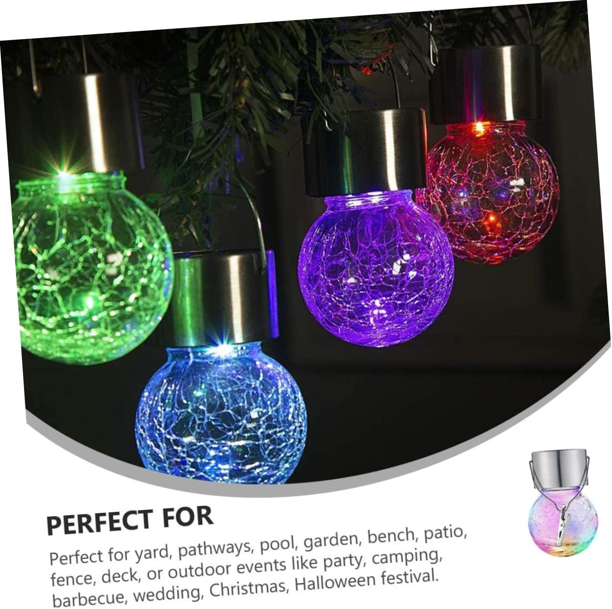 Package List 8 x solar hanging lamps with clips Characteristics - Waterproof Grade: IP65 Landscape Lamp. - Integrated Solar Panel: 2V/ 60MA Hanging Crack Ball Lamp. - Battery: 1X600mA Ni-mh batteries Garden Lamp. - Work time: up to 8-10 hours after full charged Party Lamp. - Material: Glass and stainless steel Crackle Ball Light. - Power Type: Solar Power Decorative Light. - Light source: 1 LED light Solar Crack Ball. - Light Color: Colorful Railing Crack Ball Light. - Voltage: 2V. - Charging time: 6-8hours. - Good sealing performance, good waterproof level, easy to deal with all kinds of weather Solar Power Light. - Come with clips Light Crack Ball Lamp. - Easy installation, safety and environmental protection, healthy lighting Yard Lamp. - The lamp is made of glass and stainless steel material, fine workmanship, durable and sturdy Solar Hanging Light. - Would be a great photography prop, and a cool prop. Also great items for home, garden decoration Outdoor Light. - Great for collection of decorative items and it can be used as a suitable garden decor.Goods Informationoutdoor decorative solar lights With waterproof design, it is one of for you.mini solar light Made of for durable and practical use.glass globe pendant light Are you looking for a professional, yet affordable solar lamp? , ! Our professional solar lamp will meet your needs