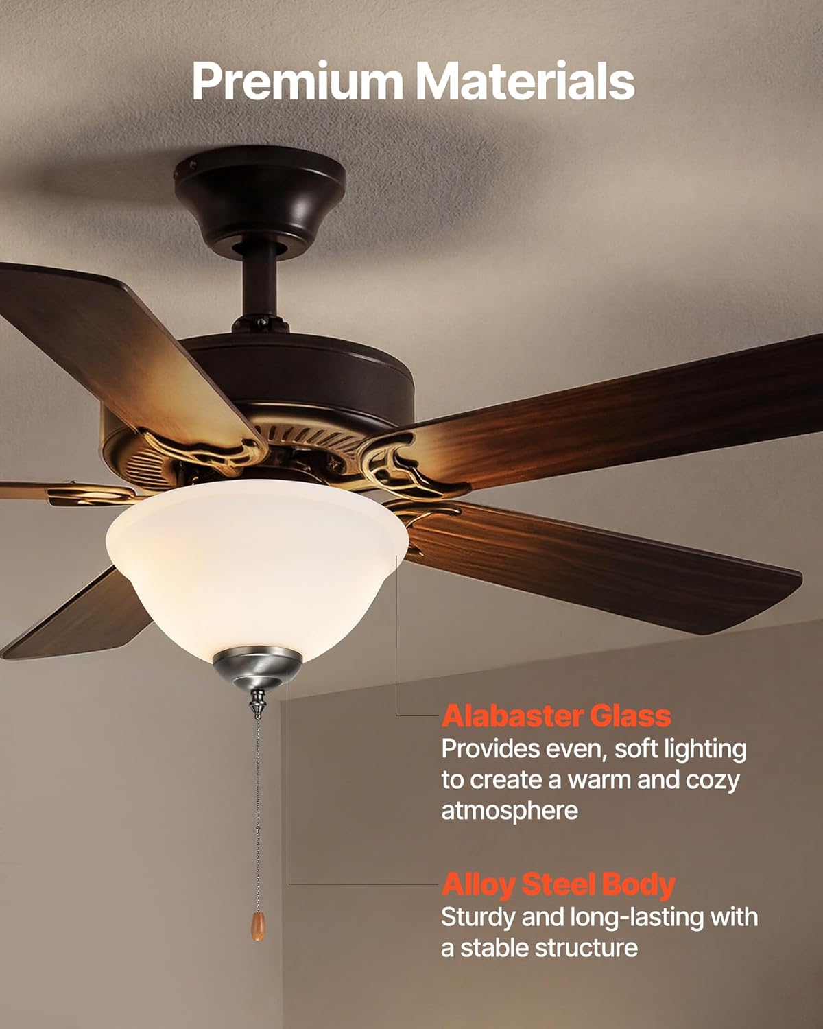 Ceiling Fan Light Kit This ceiling fan light kit measures 11.81 in / 300 mm in width and 6.42 in / 163 mm in height. It includes two 3000K, 750-lumen bulbs that provide a soft, warm glow. The alabaster glass shade gently diffuses the light for a cozy ambiance, while the alloy steel body is sturdy and long-lasting. Ideal for the living room, dining room, or bedroom, it enhances your home’s style and creates a welcoming atmosphere. A pull-chain switch makes it easy to turn the light on and off. Key Features Practical Accessory This ceiling fan light kit measures 11.81 in / 300 mm in width and 6.42 in / 163 mm in height. It can be installed directly on your ceiling fan, providing both cooling and lighting functions. Soft Lighting This fan light kit includes two 3000K, 750-lumen bulbs that deliver a gentle, warm glow, adding a stylish, upscale touch to your home. Versatile Style Ideal for the living room or dining room, our universal ceiling fan light kit blends easily with a variety of home décor styles. Warm & Cozy Light Our warm, soft ceiling fan light kit only is ideal for bedrooms, creating a cozy atmosphere that helps you relax both physically and mentally. Premium Materials The lampshade is made of alabaster glass, providing soft and warm light. Crafted from alloy steel, the ceiling fan led light kit is sturdy and long-lasting, ensuring a stable structure. Easy Operation The ceiling fan light features a pull-chain switch for simple on/off control. Specification Item Model Number: L-5-1-2 Product Type: Pull Chain Operated Bulb Brightness: 750 lm Voltage: AC 120V 60Hz Thread Connection: 1/8 NPSM US Standard Thread Exposed Wiring Length: 5.91 in / 150 mm Main Materials: Cold-Rolled Steel DC01/DC03, Glass Net Weight: 2.82 lbs / 1.28 kg Product Dimensions: 11.81 x 11.81 x 6.42 in / 300 x 300 x 163 mm Package Content 1 x Ceiling Fan Light Kit 2 x LED Bulbs (A19 E26 9W 120V Ra80 3000K 750 lm) 1 x User Manual 3 x Wire Nuts 1 x Pull Chain Switch Pendant