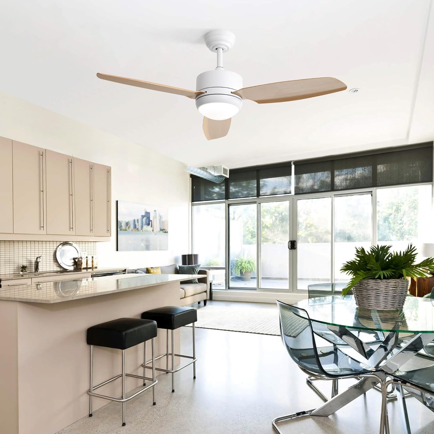 46 Inch Ceiling Fan With Light Color: White Body/ Light Woodgrain Blades Blade Material: ABS Blades Size: 46" Power Source: Reversible Dc Motor Voltage: 110V-240V50Hz/60Hz Light Source: LED 18W 3CCT Controller Type: Remote Control Special Feature: Timer Certification: ETL Downrod: 5"/10" Room Type:Farmhouse, Restaurant, Rustic, Garage, Living Room, Bedroom, Home Office, Kids Room, Balcony, Cabinet, Garage, Garden, Home, Shop, Dining Room High Quality Ceiling Fan This ceiling fan features a high-capacity DC motor, delivering powerful airflow and ensuring years of quiet performance. With its durable and modern design, this 46-inch ceiling fan is perfect for small to medium-sized rooms from 80-160 sq.ft. Reversible Ceiling Fan Reversible DC Motor Quiet Energy saving, Function Includes Forward and Reverse for Summer and Winter 2 Airflow Modes, Cooling In Summer and Keeping Warm in Winter. Modern 46 Inch Ceiling Fan This modern ceiling fan with light, each piece is carefully designed and crafted with great quality ABS blades. It gives the indoor/ outdoor decor a touch of luxury and refinement.