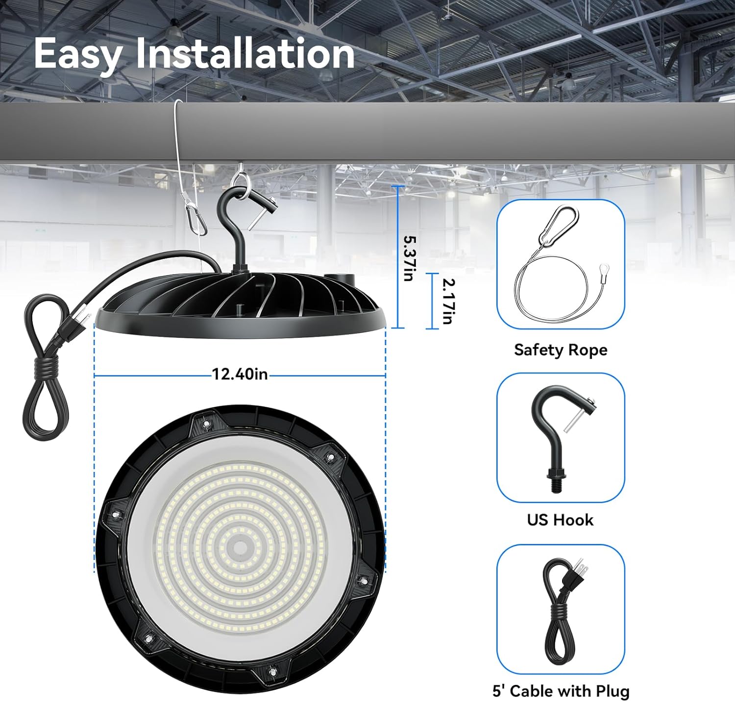 | Included Components | Cable with Plug, Safety Rope, UFO LED High Bay Light, US Hook |