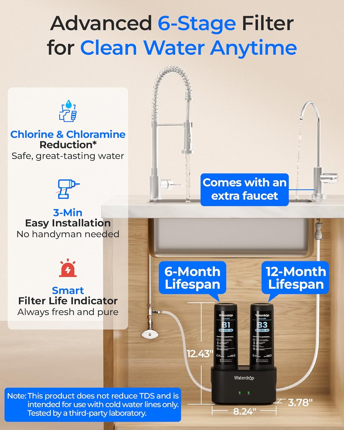 | Other Special Features of the Product | Included a new/separate faucet, Smart Filter Life Indicator, Quick Change, 2 stage Under Sink Water Filter, Reduces Chloramine, Chlorine, Bad Taste/Odor, 3min installation, 3s replacement |