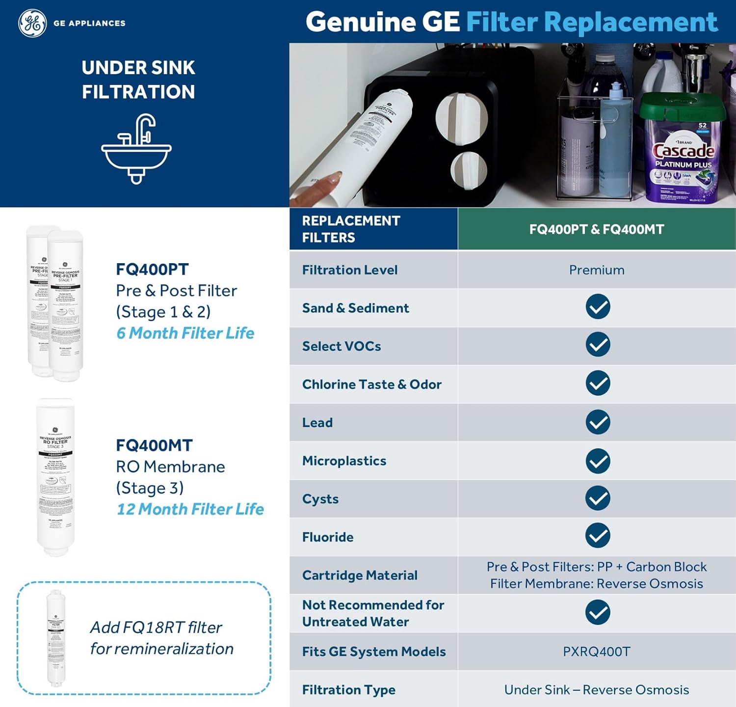 This Reverse Osmosis Water Filtration System installs under your sink to triple filter up to 11 gallons of water daily. The reverse osmosis membrane reduces microscopic impurities such as lead, ammonia, arsenic, and other impurities from your tap water to provide cleaner water for cooking and drinking.