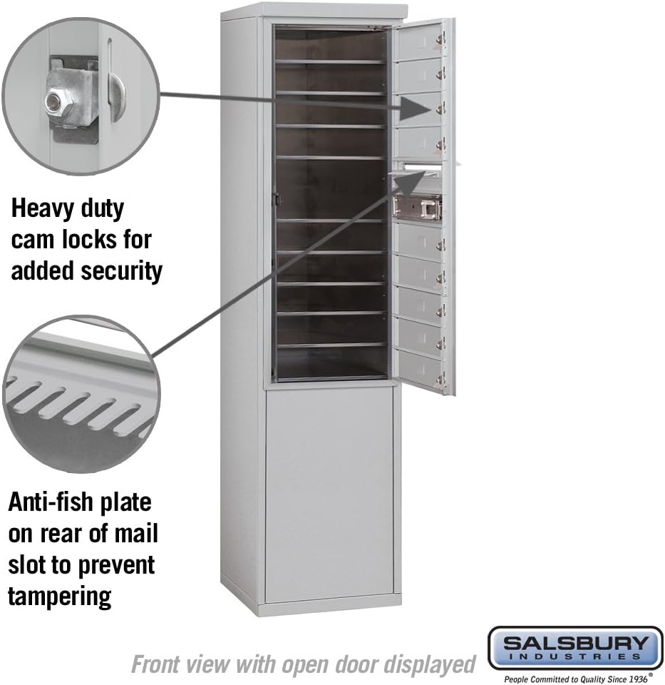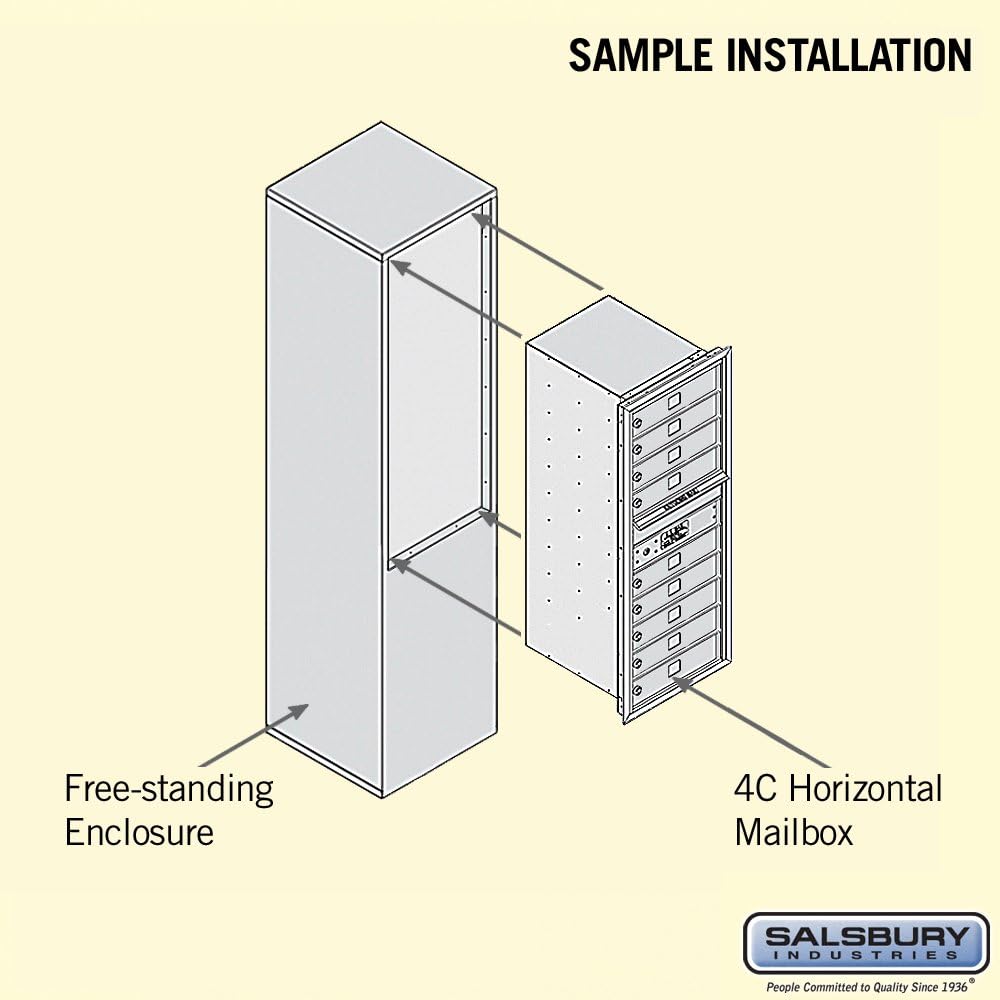 Constructed of heavy duty aluminum and stainless steel hardware, Salsbury 3900 series high security free standing 4C mailboxes can be accessed from the front through one (1) easy opening master door panel. These units provide a convenient means of installing 4C horizontal mailboxes in locations where a wall mounted application is not desired or available. The 3900 series 4C free standing mailboxes are durable and corrosion resistant that can be used indoors or outdoors and feature a powder coated finish in aluminum, bronze, gold and sandstone. All mailbox doors include a heavy-duty cam lock with a dust/rain shield and includes three (3) keys. A compartment equivalent to two (2) 3.25 in. high standard mailbox doors is used for outgoing mail collection and is labeled "Outgoing Mail". The outgoing mail compartment includes a weather protection flap, mail slot and carrier access door, which includes the U.S.P.S master lock access door (lock installed by the U.S.P.S), and anti-fish plate on rear of mail slot to prevent tampering of outgoing mail. The 4C free standing unit include a U.S.P.S. approved 4C horizontal mailbox unit and matching enclosure. Ideal for apartments, condominiums, commercial buildings, residential developments, colleges, schools, private postal centers, corporate mail centers, military bases, government agencies and many other applications. Salsbury Industries is an ISO 9001: 2008 certified company and has excelled in the field of manufacturing since 1936.