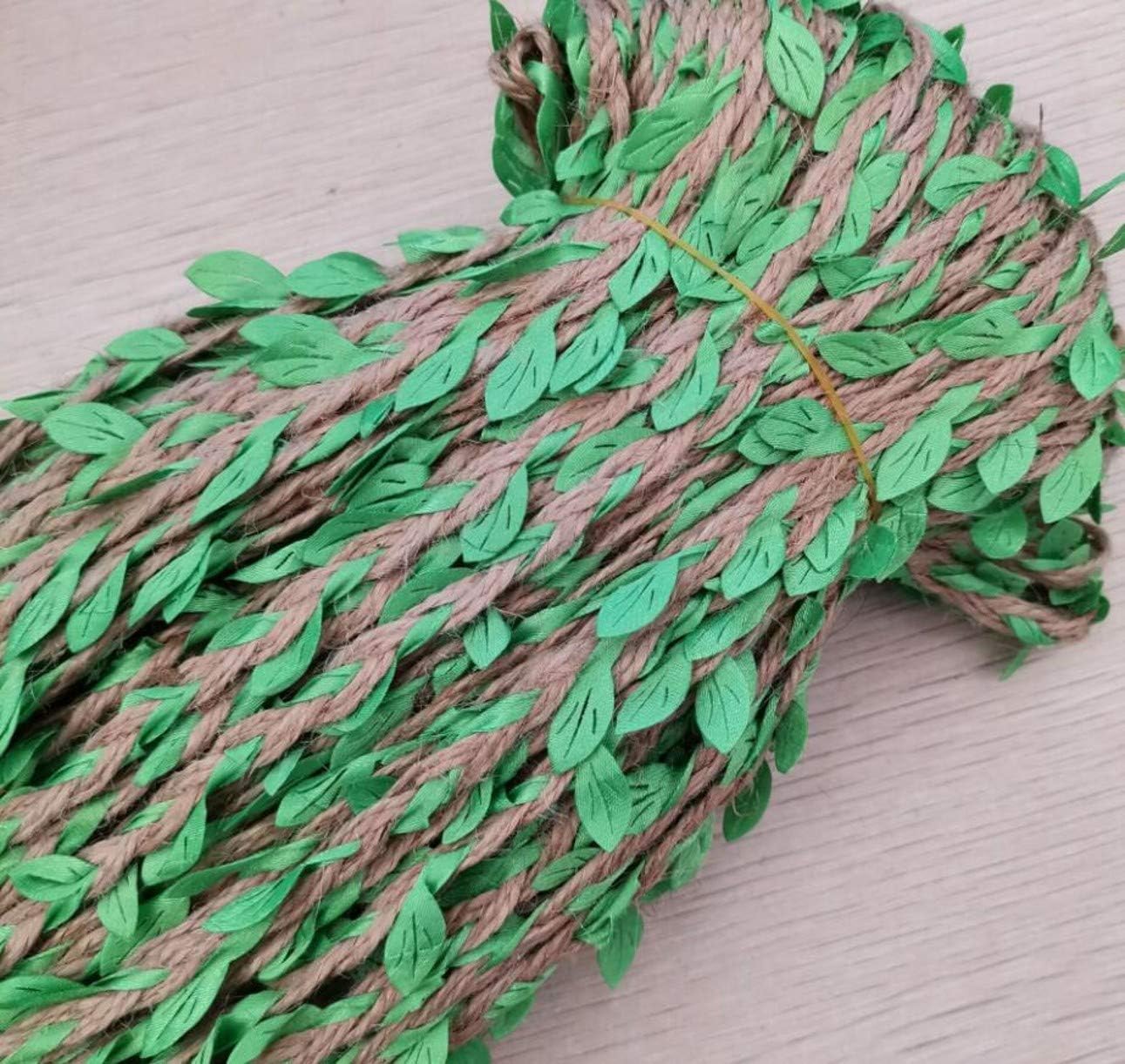 made of polyester Color: Green Leaf Each roll of burlap twine with leaves measures 328 feet (100m), and each leaf measures 0.39 inch (10mm) Wide Application: The burlap twine is perfect to add a natural look, a great decoration for flower shop, photo wall, gardening, farmhouse, DIY, handicrafts, wedding, party, inside or outside, festival events, etc Durable and Reusable: Our jute rope is soft but strong, it can be used for a long time, and gives you a natural touch.