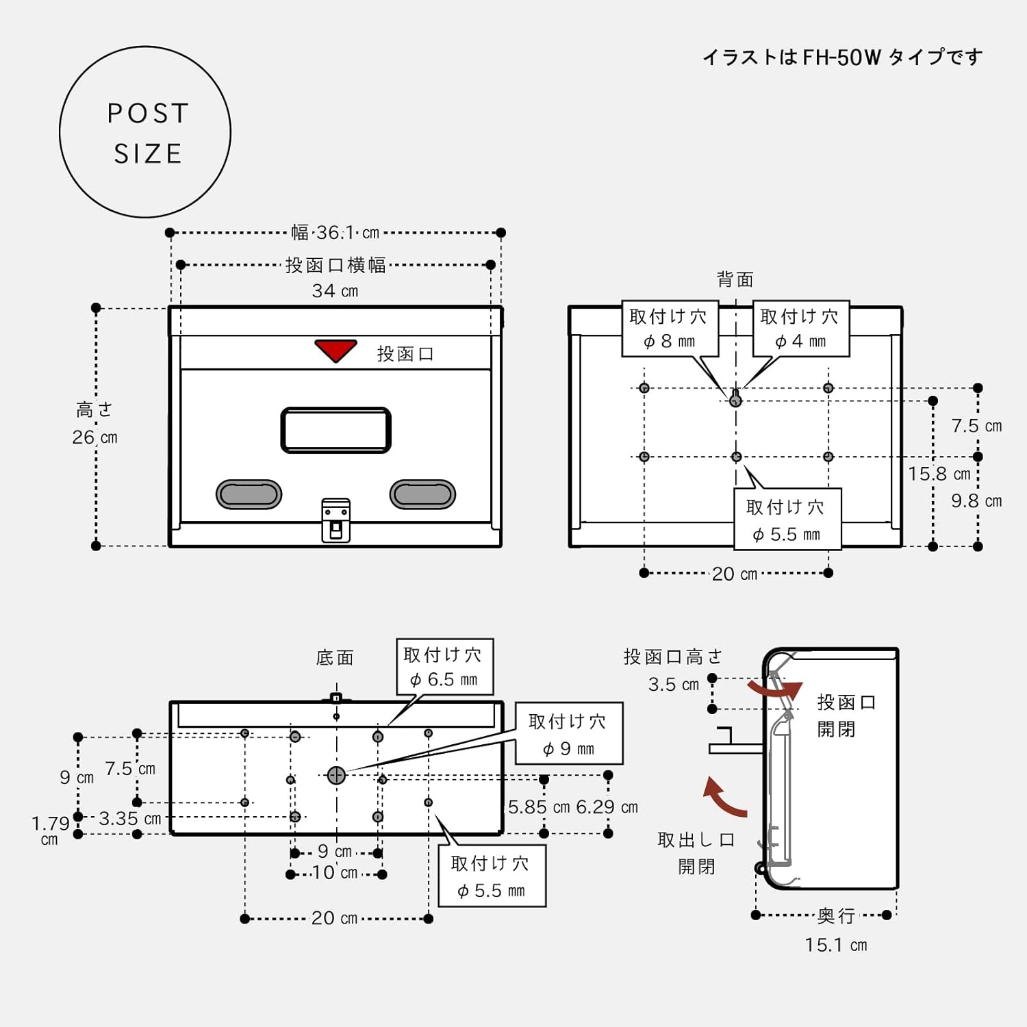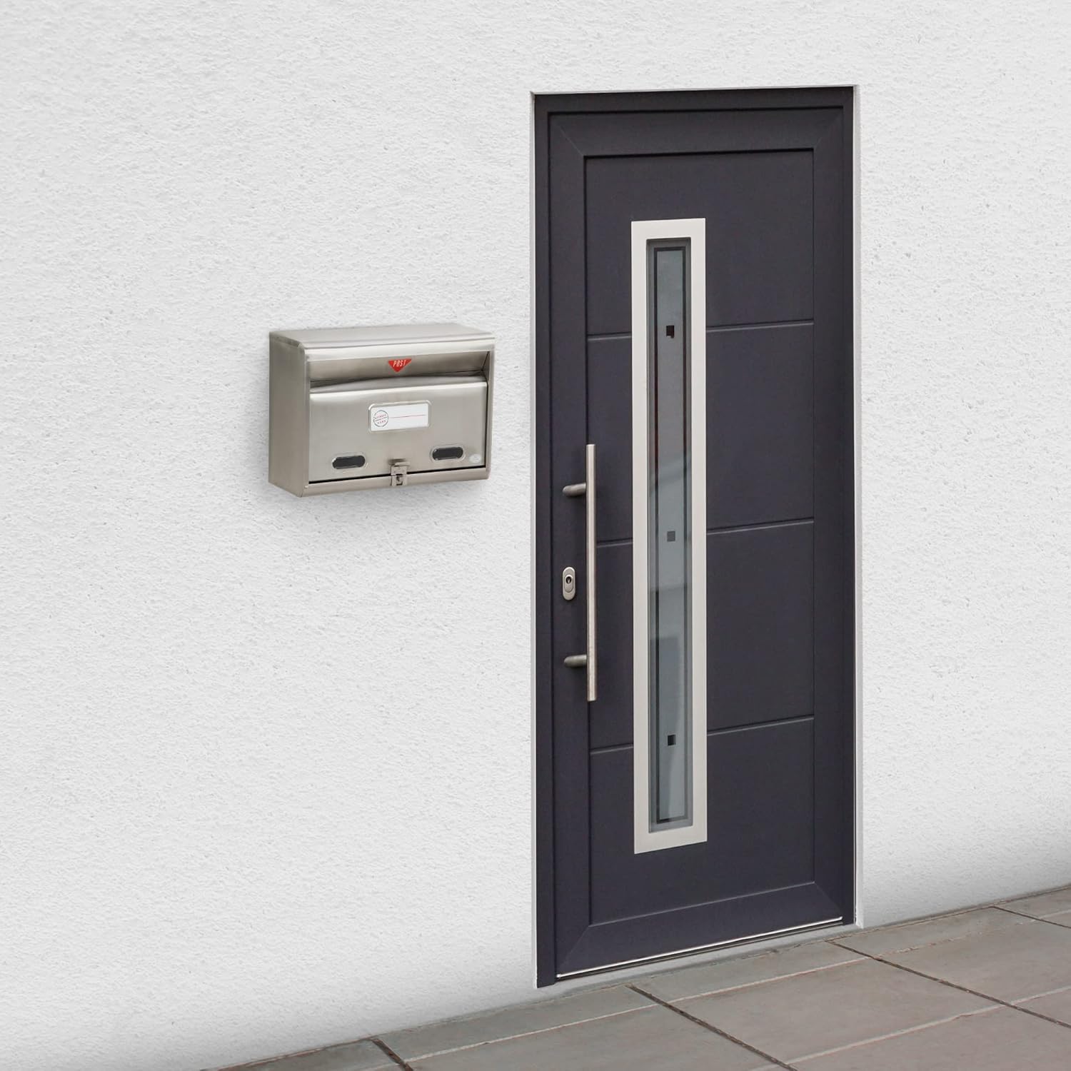 Wide enough to easily fit A4 envelopes. Embossed type for easy removal of postcards. The mailbox has a spring loaded design that prevents mail from getting wet even in the rain or wind.